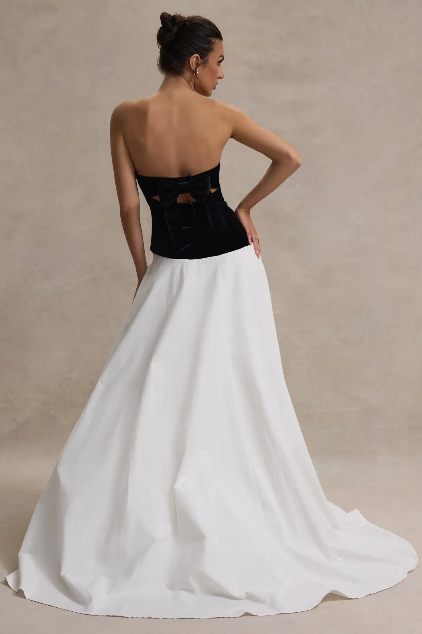 Made for black tie events. Lucienne exudes high voltage glamour. Boasting a black velvet corset highlighted by a fully boned bodice and wired neckline. this sculpting piece was designed to sculpt your silhouette. A dainty bow detail sits elegantly on a cut-out back. before flowing into an enchanting volume skirt.