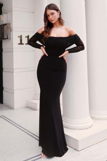 Meet Madeleine. a beloved silhouette from the Club L archives reintroduced in our premium black jersey with a Bardot neckline wrapped by flattering ruching. Complementing this bodice are long mesh sleeves whilst a floor-length fishtail skirt guarantees you make a memorable entrance at any formal event from weddings to grand engagements.
