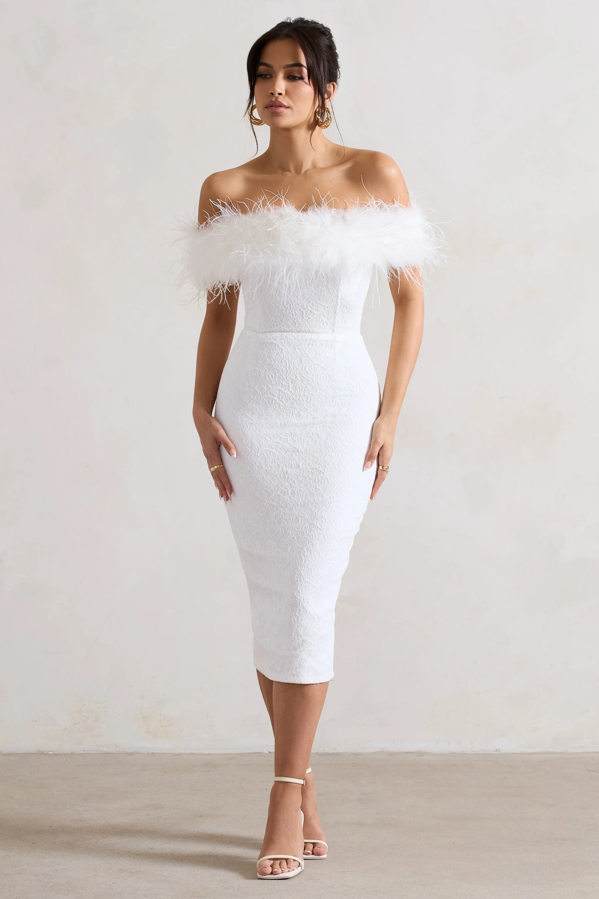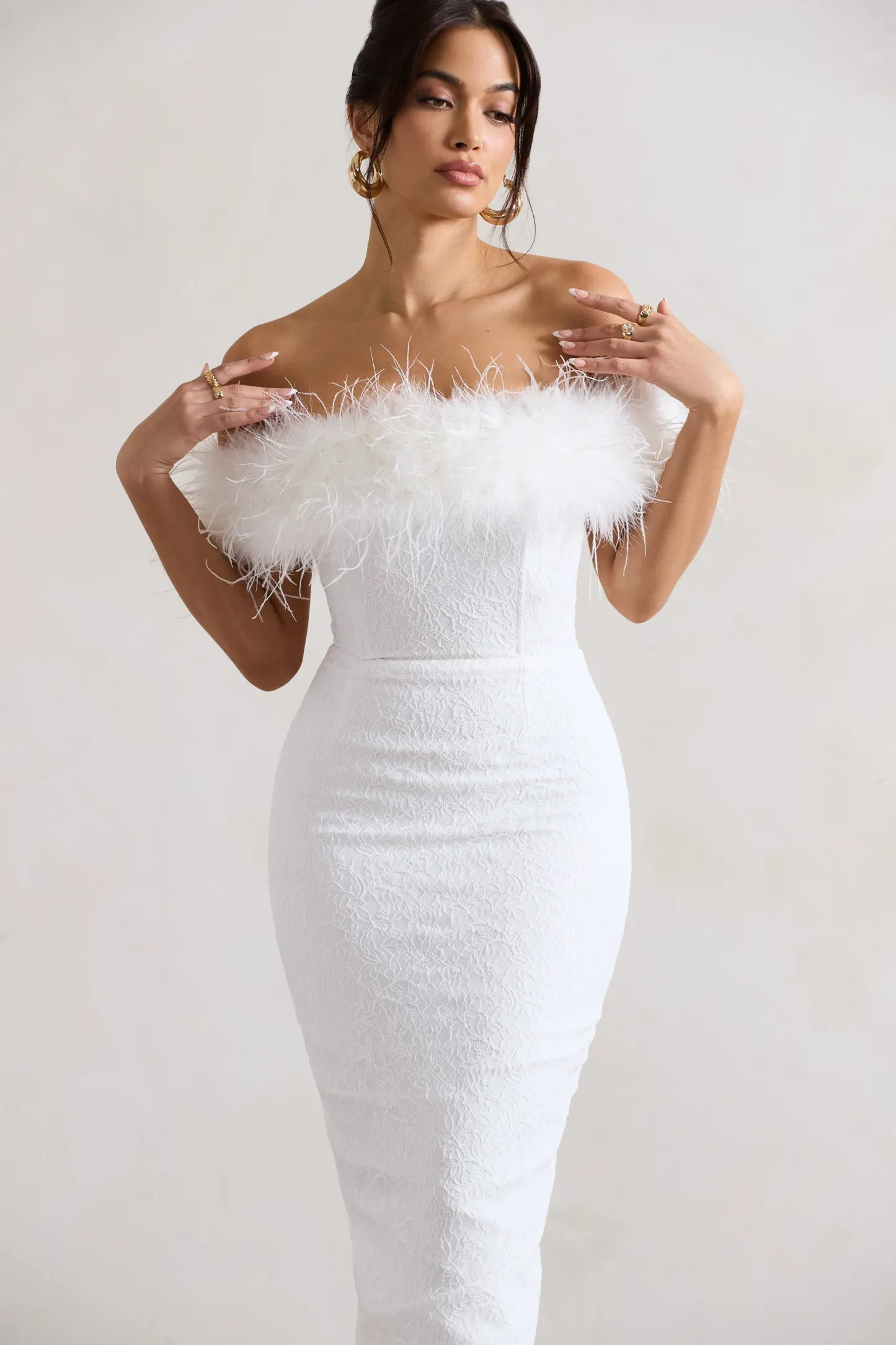 Exude elegance in Maiden. our graceful white lace midi dress. This piece showcases a figure hugging bodycon fit thats finished with a lavish feather trimmed bardot neckline. Maiden is the perfect evening wear attire. especially when paired with our Just A Fling court heels.