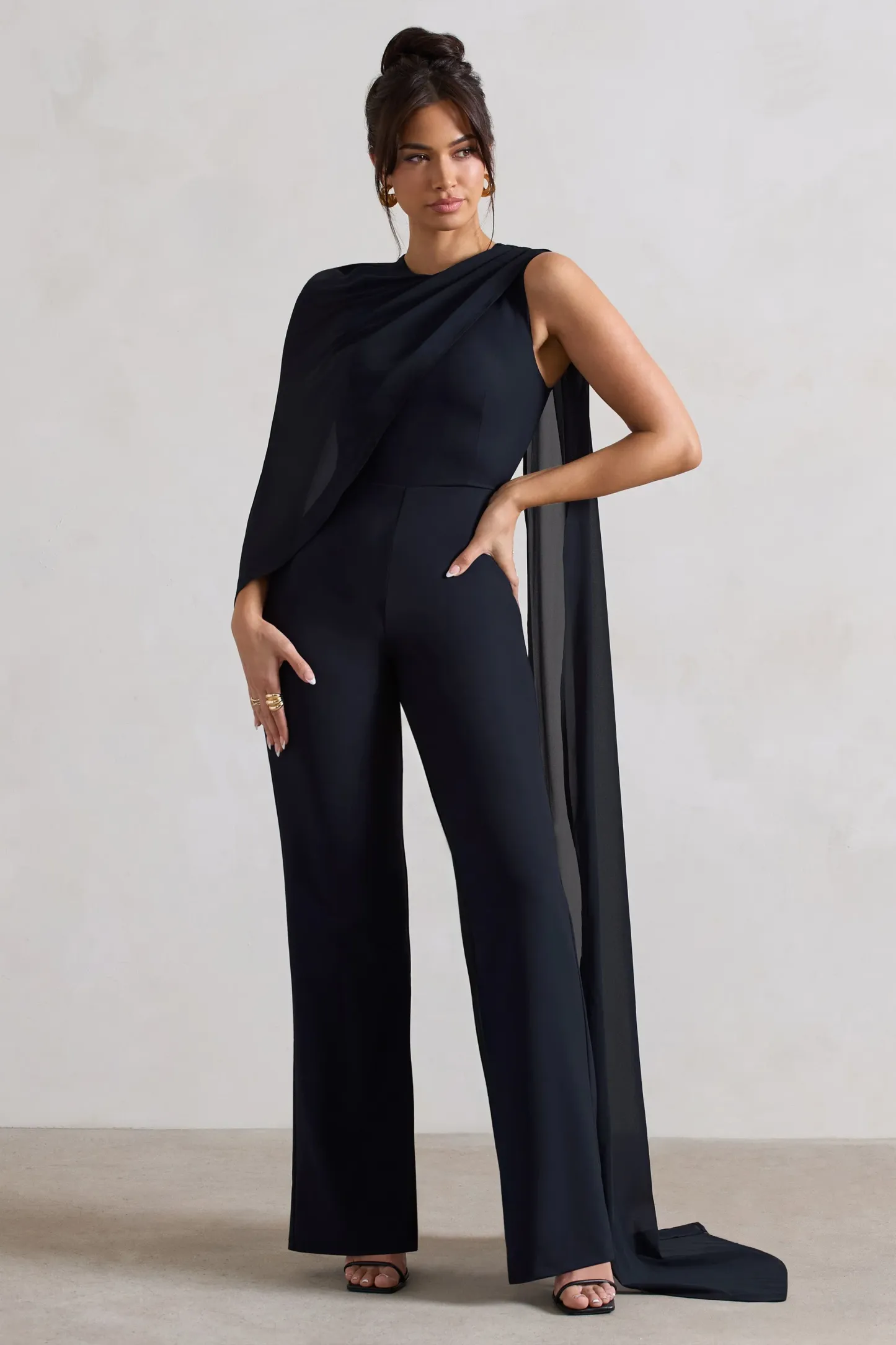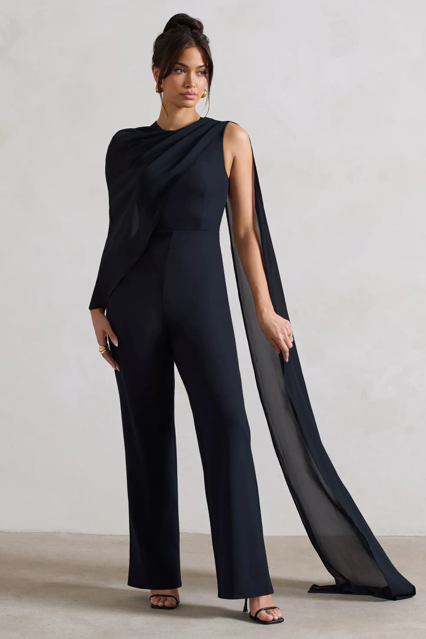 Simple and graceful. our Malina jumpsuit showcases a minimalistic silhouette with an added bit of elegance. Expertly cut in a premium crepe. this jumpsuit has a flattering fitted bodice and classic straight legs. The main feature if this jumpsuit is the chiffon cape that drapes over the bodice and down the back adding effortless luxury. Pair Malina with a sleek bun and our Sigrid earrings to complete this occasion look.