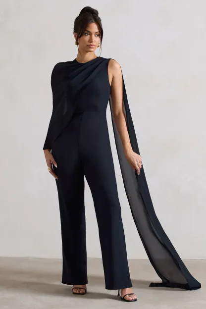 Navy Straight-Leg Jumpsuit With Chiffon Cape