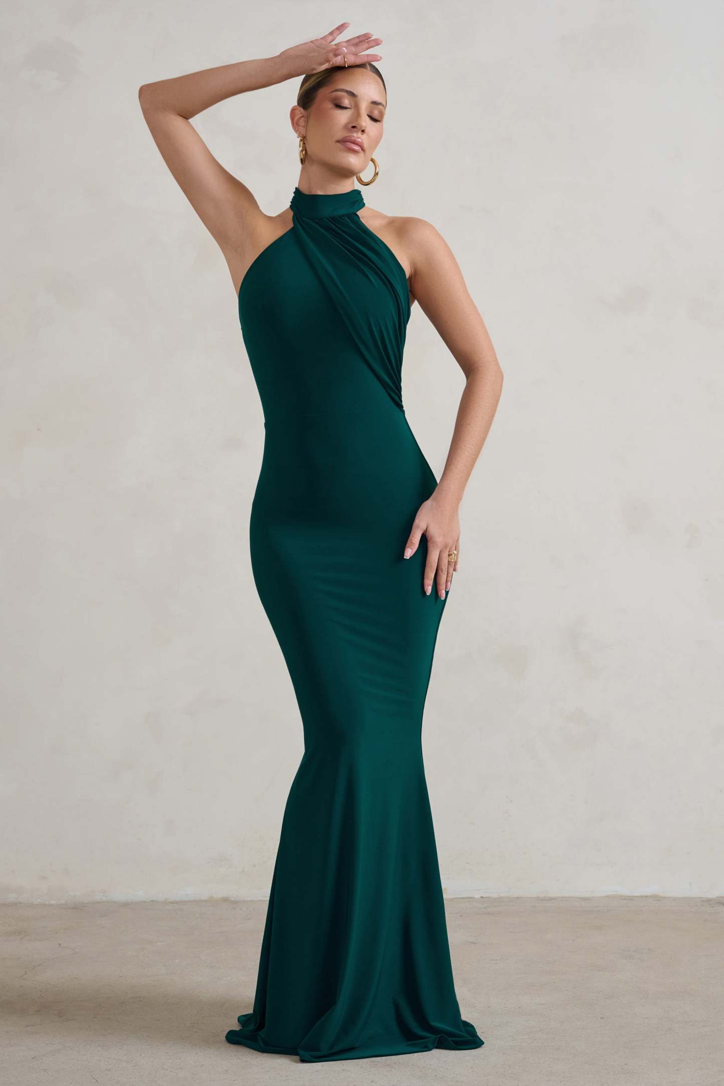 From its draped neckline to its statement train. Marion is the showstopper your wardrobe has been missing. The maxi dress is made from our finest green jersey in a halter silhouette closed by two covered buttons. A godet skirt makes Marion even more eye-catching and ensures you make a memorable exit.
