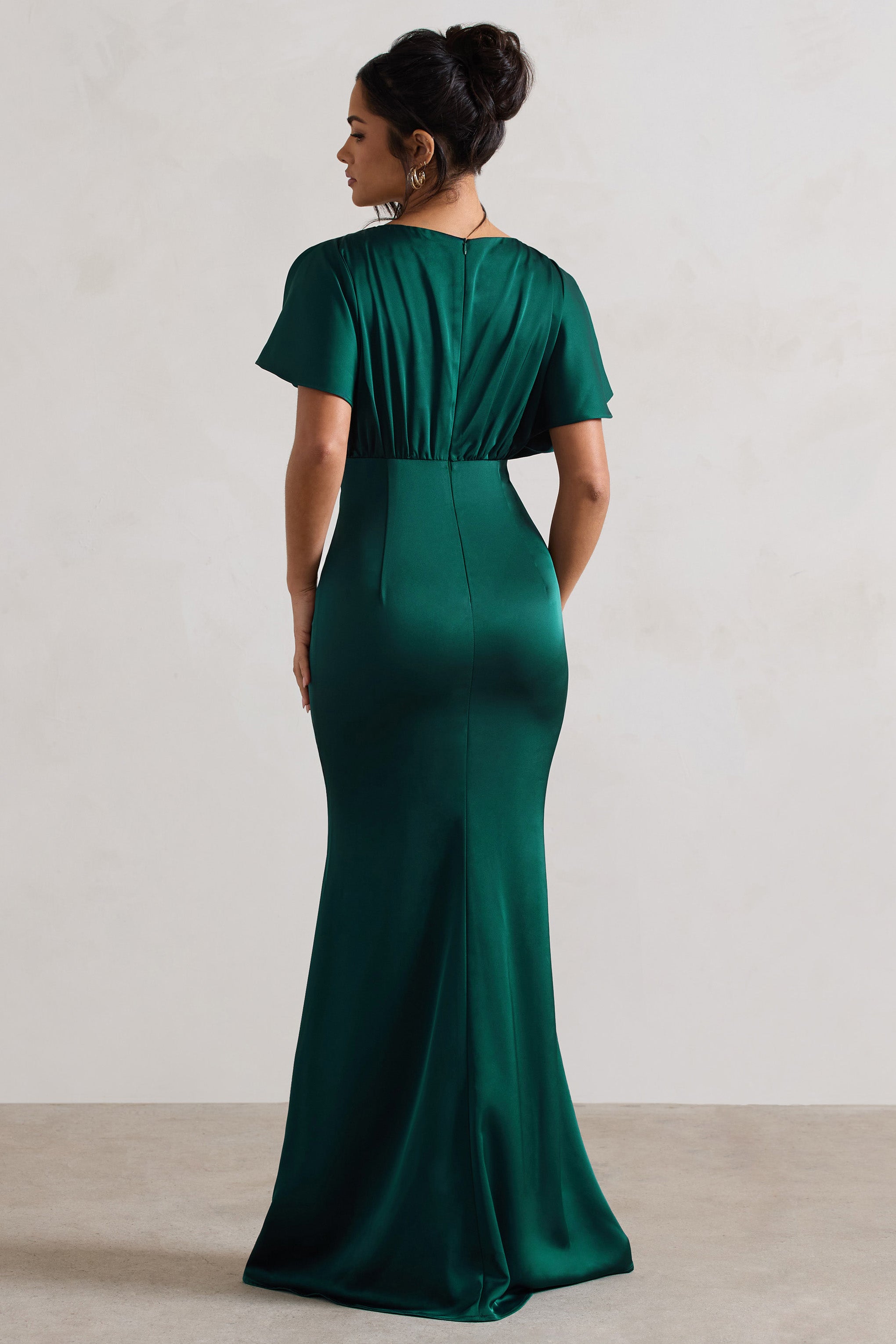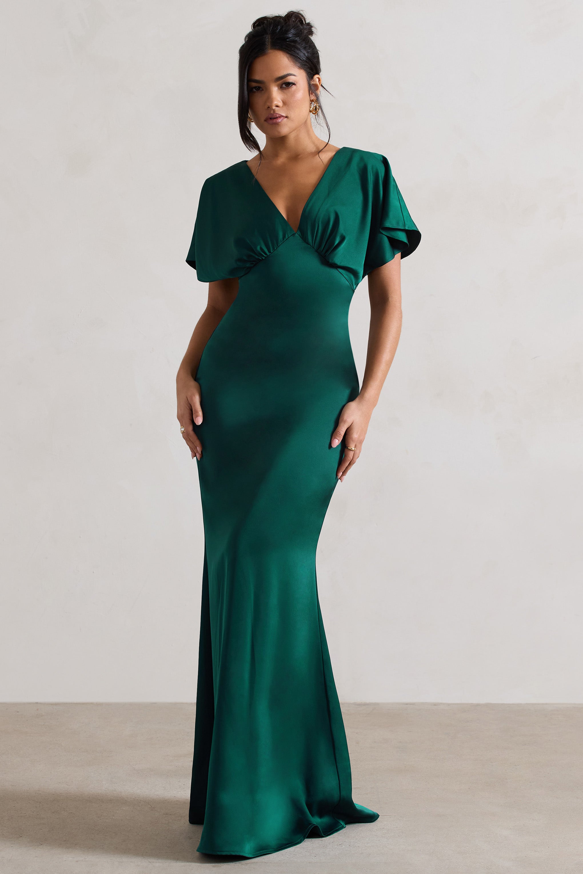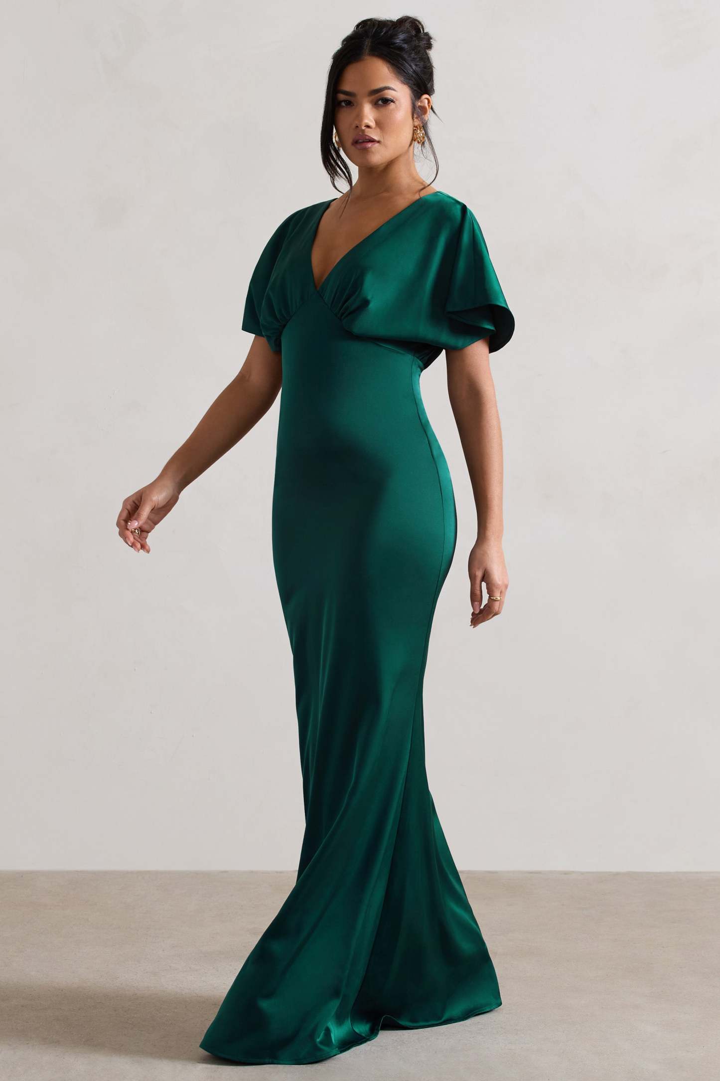 Marisa Dark Green Satin V-Neck Flutter-Sleeve Maxi Dress