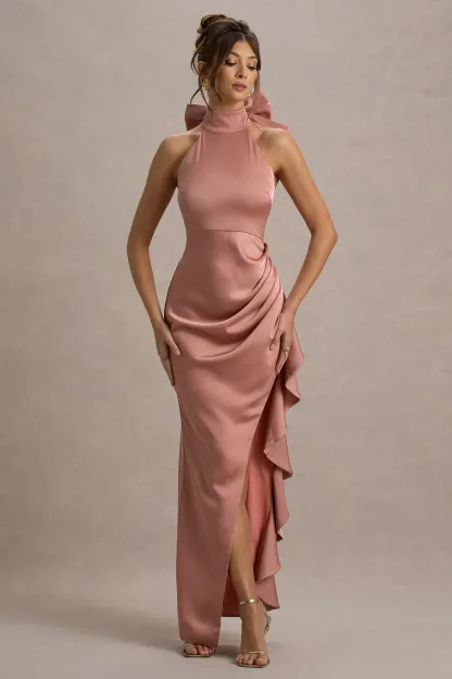 Defined by timeless sophistication and graceful detail. Maureen is a captivating choice for your most elegant occasions. Crafted from our premium stretch satin in a sleek pink hue. this maxi dress features a refined high-neckline that exudes understated glamour. The draped bodice flows effortlessly into a figure-skimming silhouette. while a subtle side split adds a hint of allure.