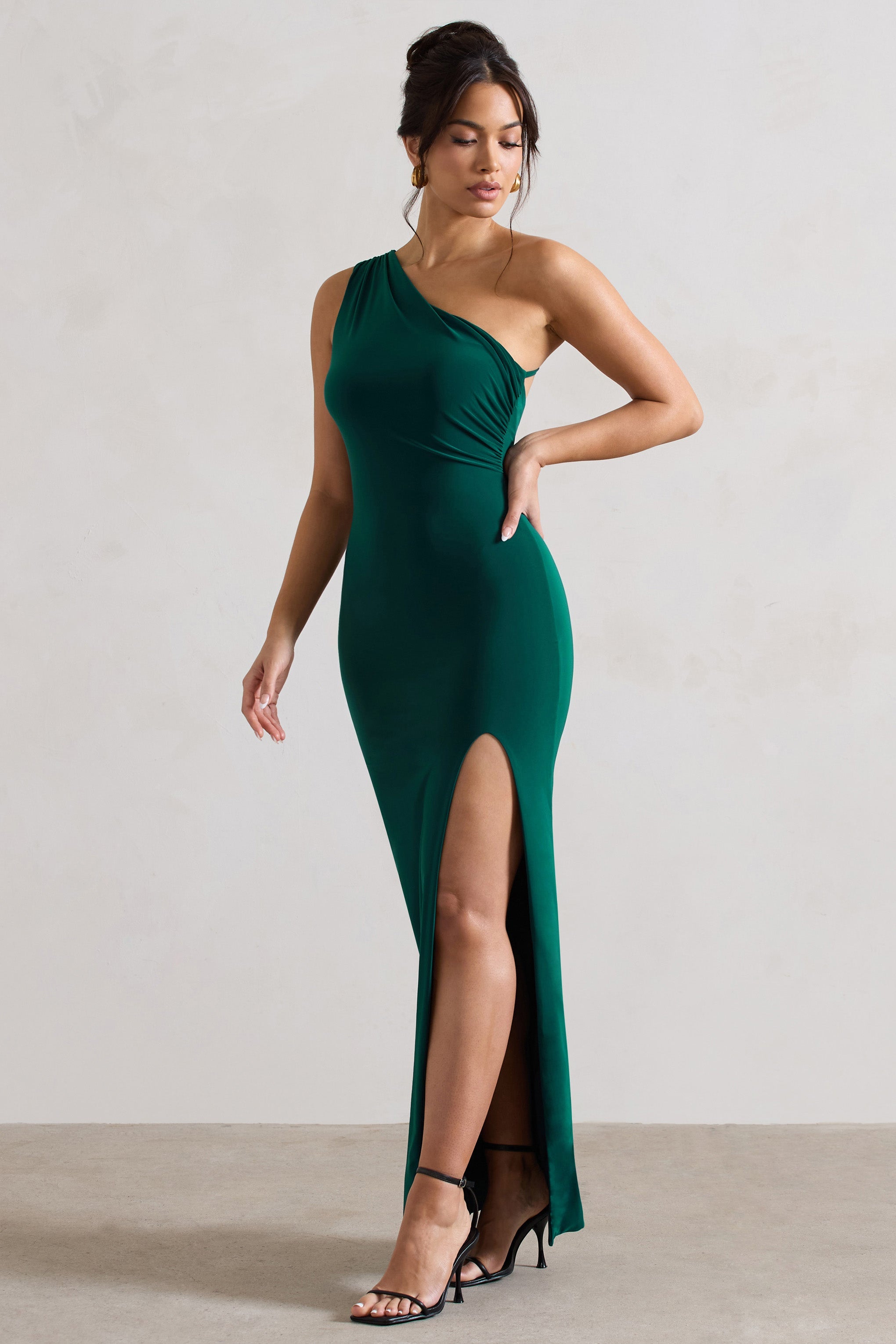 Melody Bottle Green One Shoulder Cowl-Back Split Maxi Dress