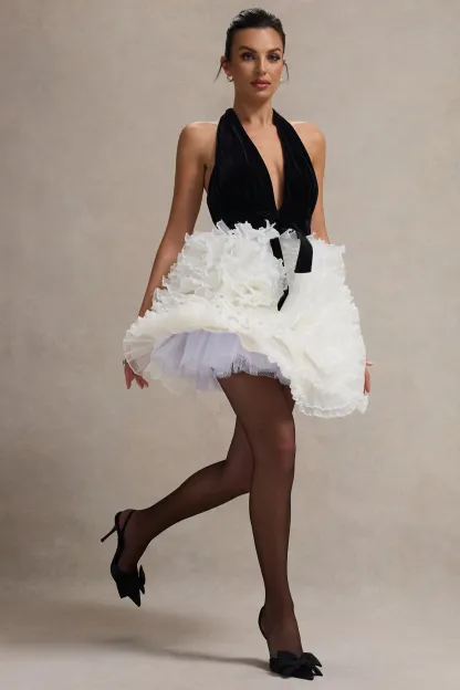 Make memorable moments in Meringue. our sweetest mini dress. Crafted in our signature soft velvet. this mini boasts a daring plunge neckline equipped with a self-halter for a personalised fit. What transcends this piece is a volume tulle skirt in a rich cream shade.