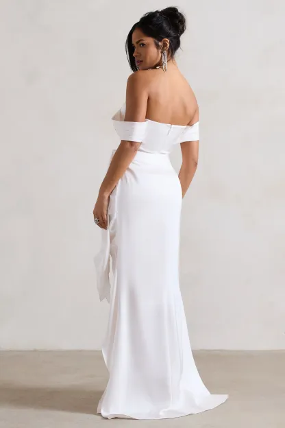 Cream Satin Bardot Maxi Dress With Detachable Skirt