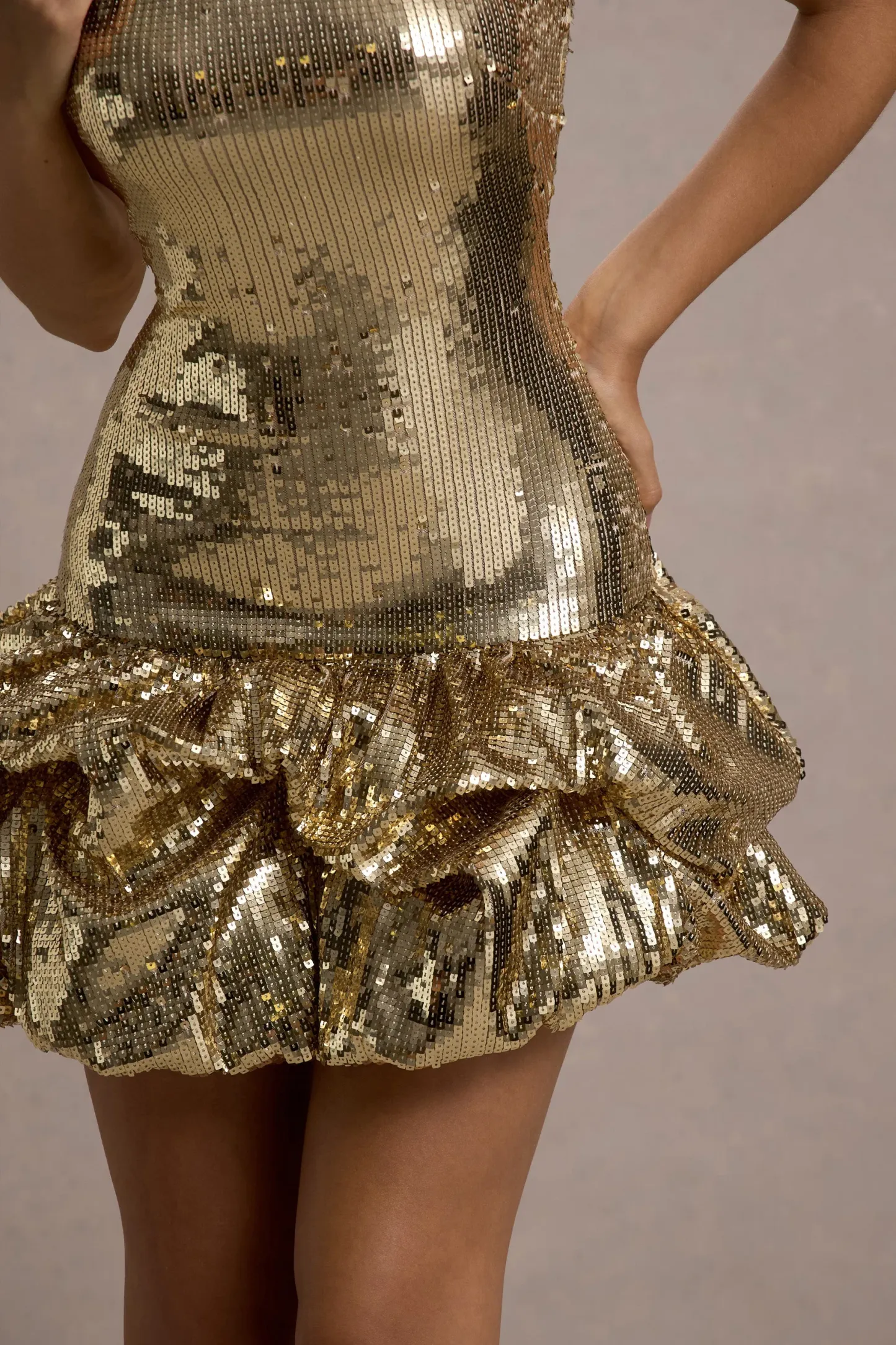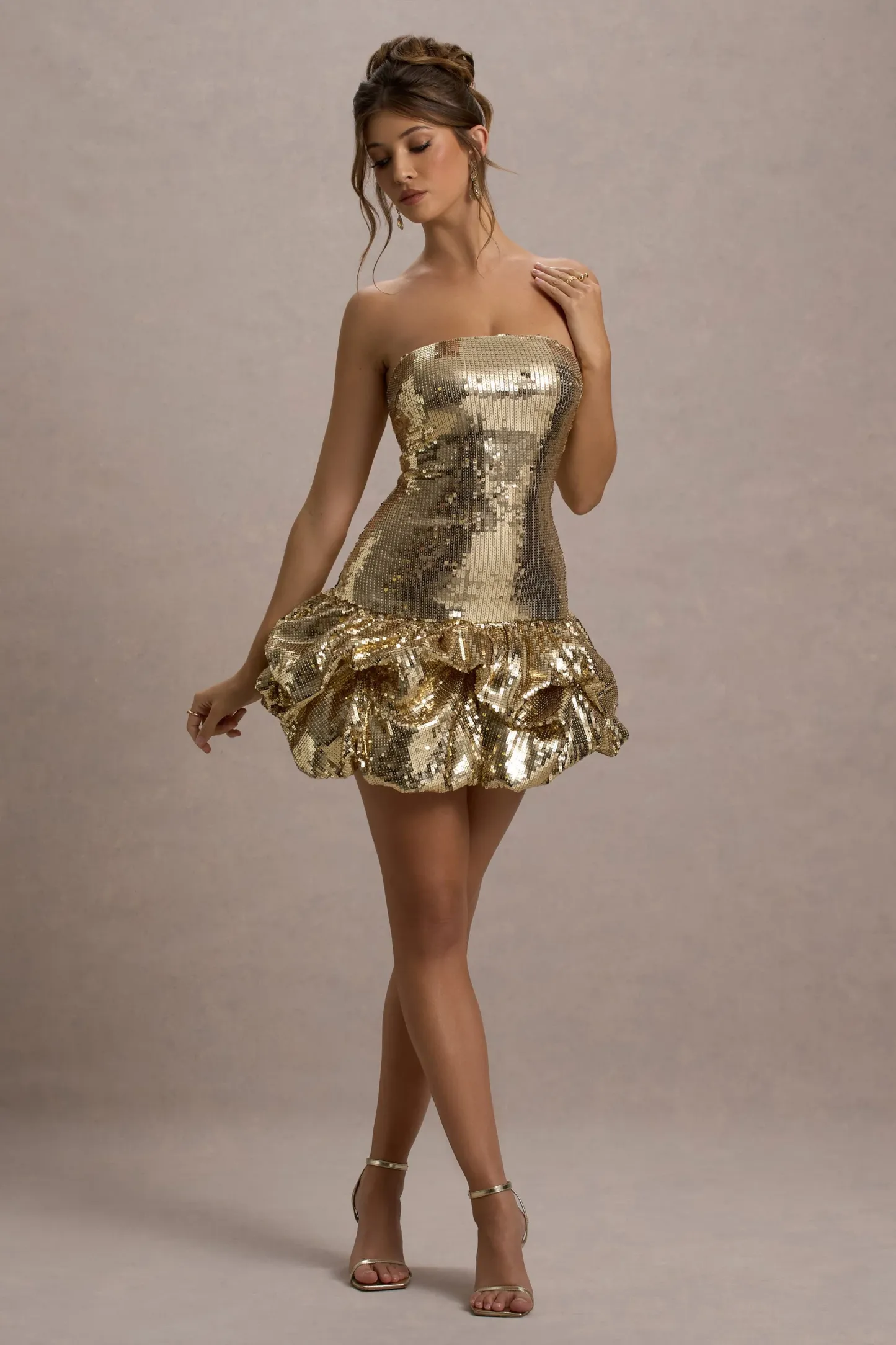 Gold Sequin Bandeau Mini Dress With Puff Hem