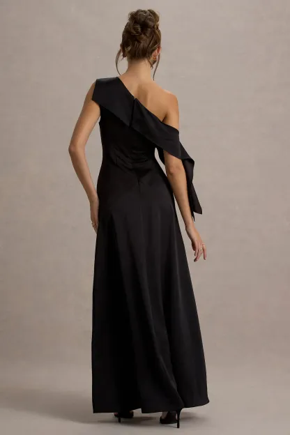 Black Satin Asymmetric Bardot Draped Maxi Dress