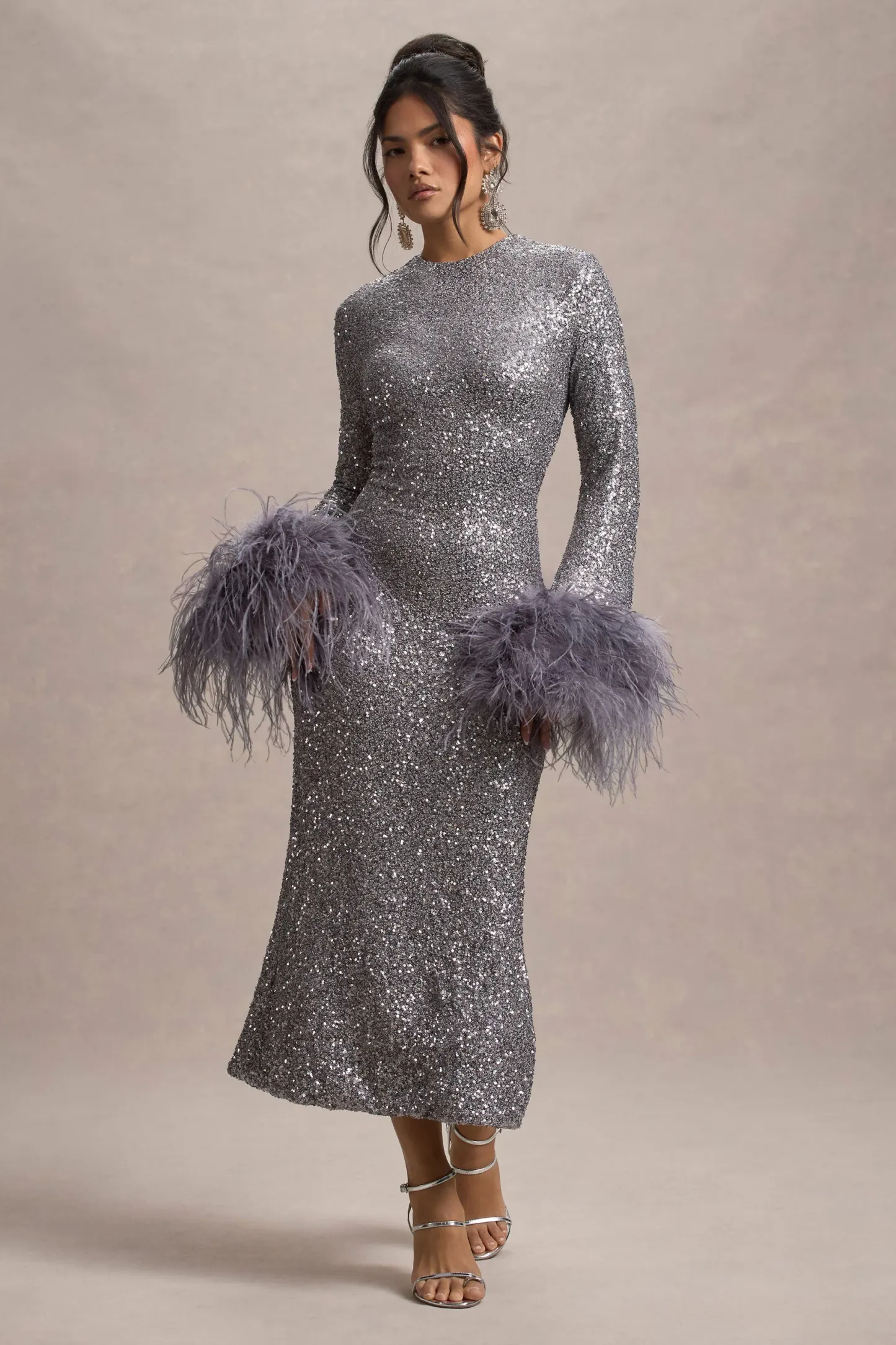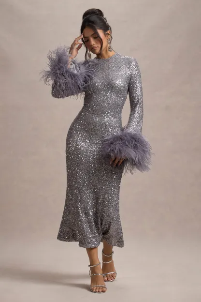 Silver Sequin Long-Sleeve Midi Dress With Feather Cuffs