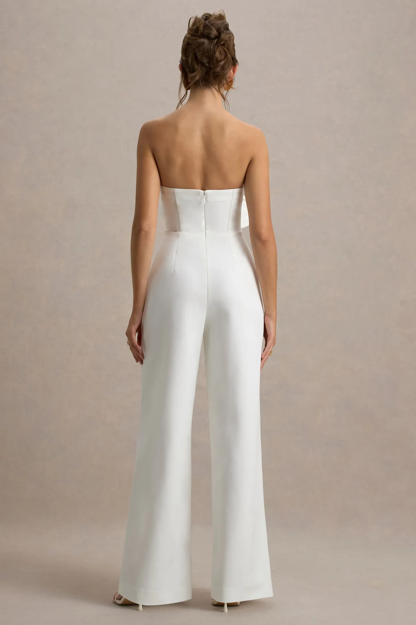 White Bandeau Wide-Leg Jumpsuit With Large Floral Corsage