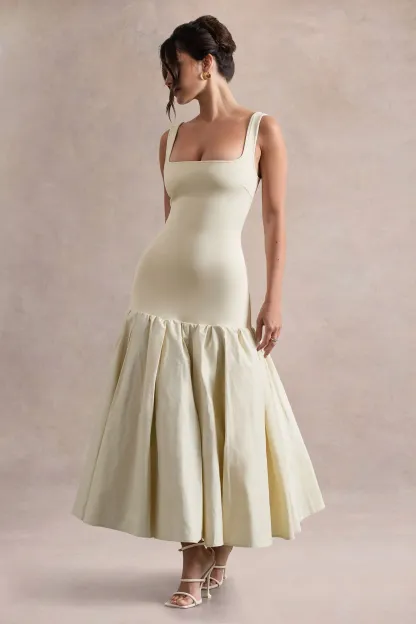 If you're looking for a make an entrance dress Parida is the one. Crafted in a flattering jersey in an elegant cream this midi is detailed with a scoop neck and voluminous peplum hem creating dimension and drama. Parida showcases a glamorous sophisticated silhouette perfectly styled with some strappy stilettos for your next event.