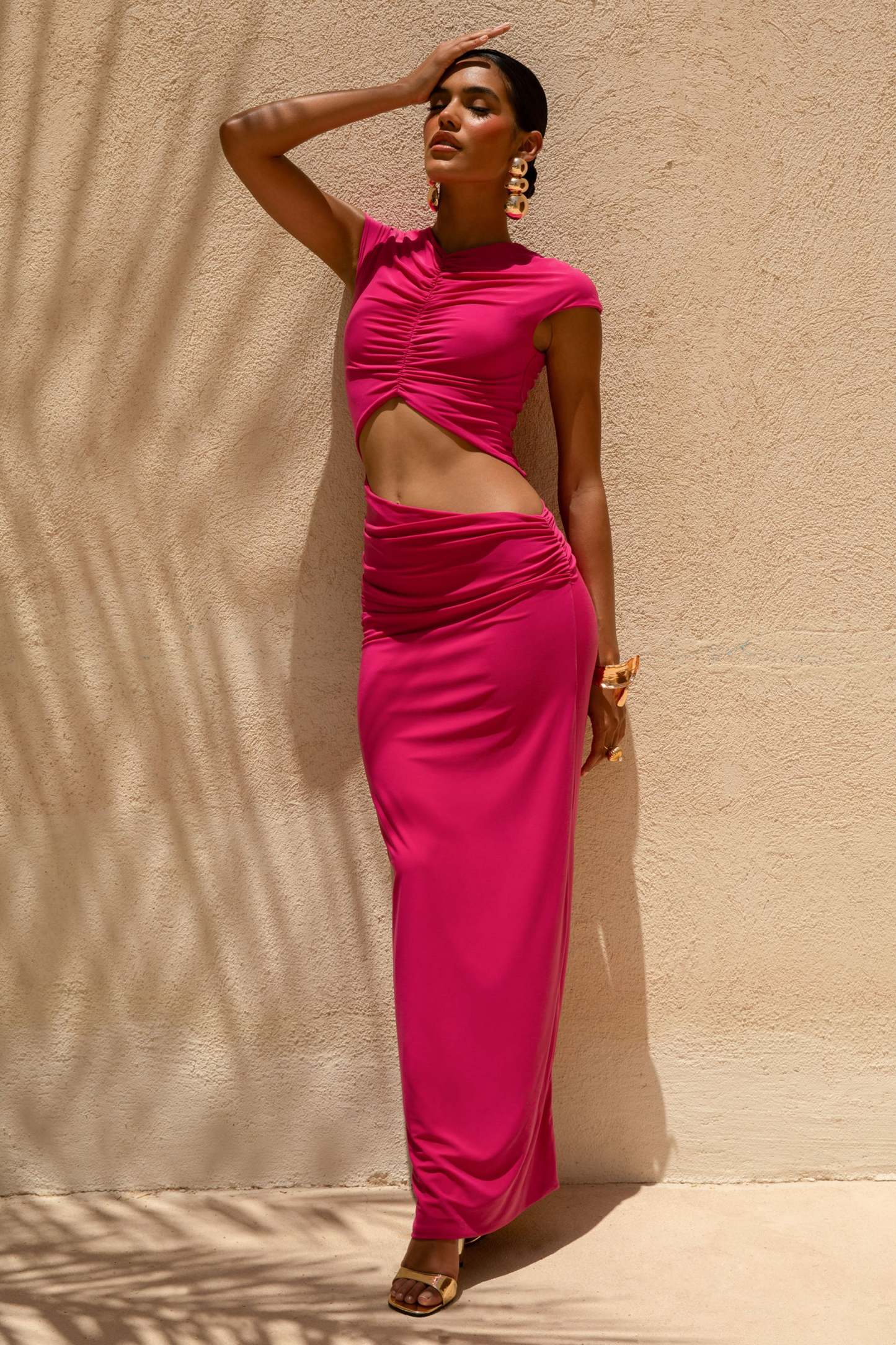 Introducing Pia. the maxi bound to turn heads wherever you go. Crafted in our premium hot pink jersey. this piece is one of a kind. Completed with short sleeves and a daring waist cut-out detail. Pia is perfect for those sunset dates on the beach. Pair with oversized hoop earrings for the chicest look at your next destination.