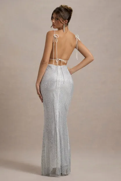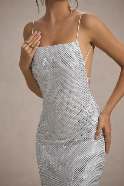 Silver Embellished Square-Neck Open-Back Maxi Dress