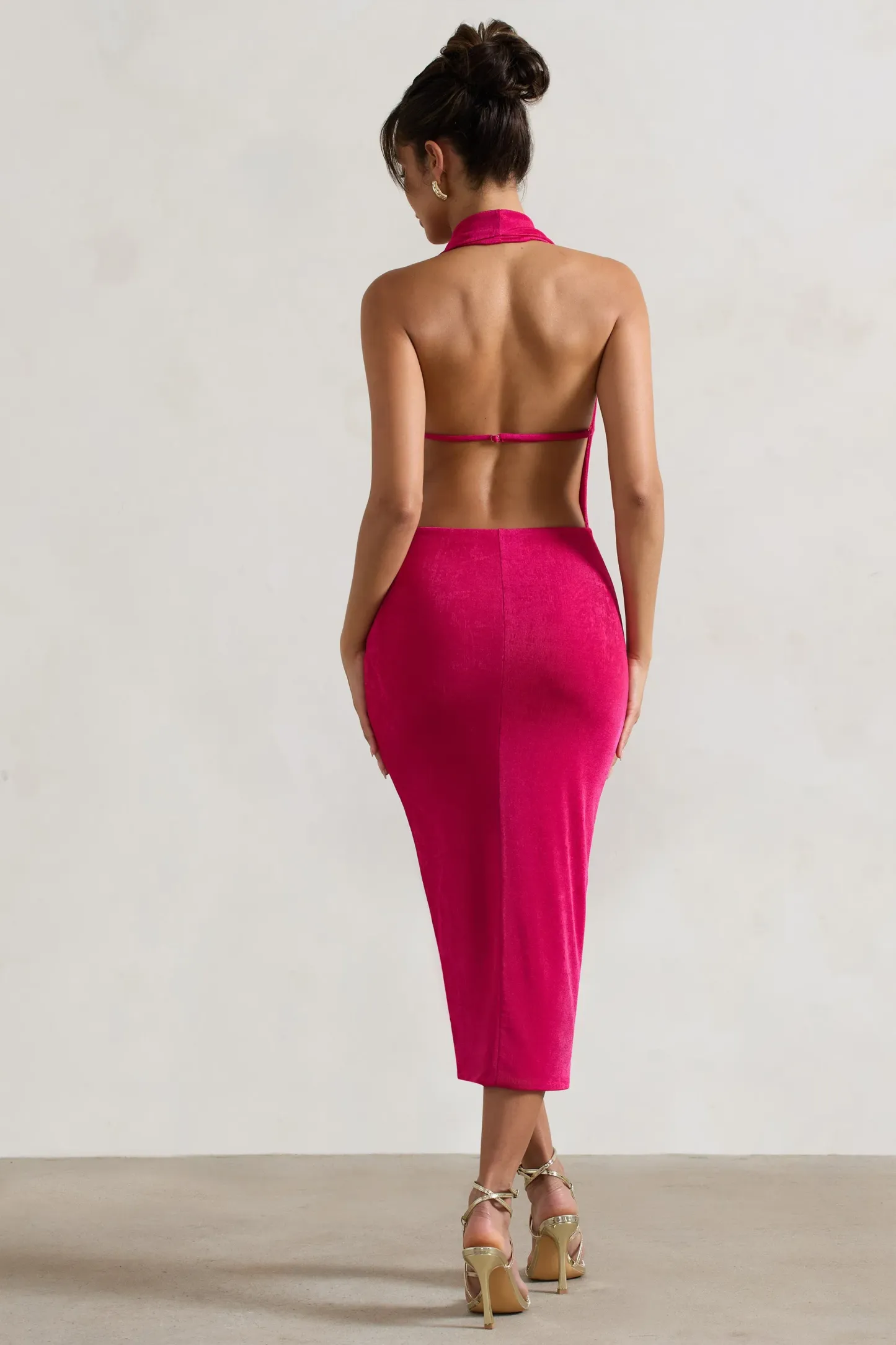 Crafted in a sultry silhouette of hot pink acetate. Raleigh is a striking addition to any wardrobe. Boasting a plunge cowl neckline. this bodycon is detailed by a delicate cami strap that sits across an alluring open back. Pair yours with a tousled bun at your next event to show off all this midi dress has to offer.