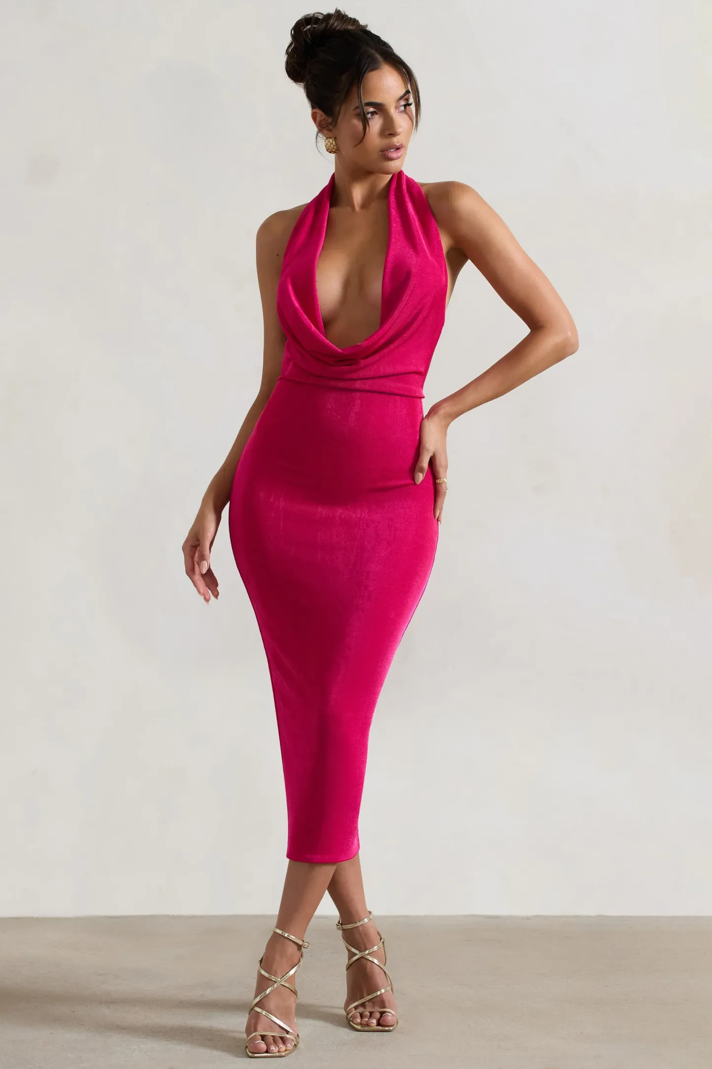 Hot Pink Cowl-Neck Midi Dress