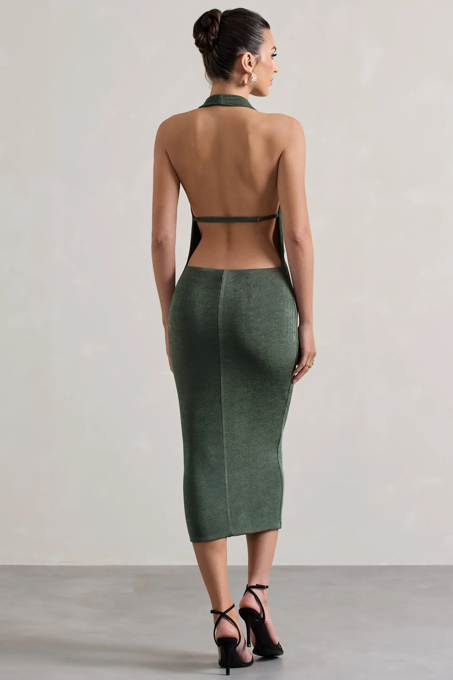 Crafted in a sultry silhouette of sage green acetate. Raleigh is a striking addition to any wardrobe. Boasting a plunge cowl neckline. this bodycon is detailed by a delicate cami strap that sits across an alluring open back. Pair yours with a tousled bun at your next event to show off all this midi dress has to offer.