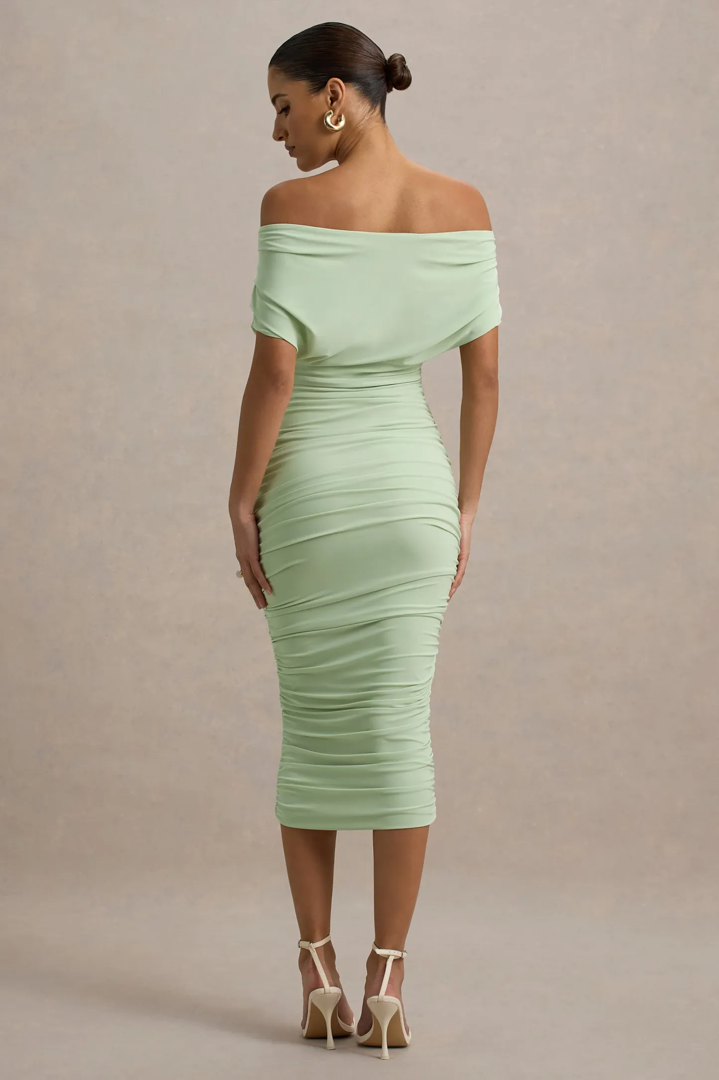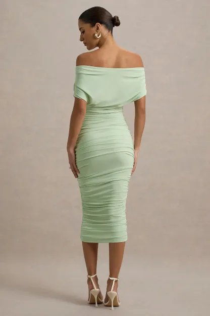 Light Green Bardot Ruched Midi Dress