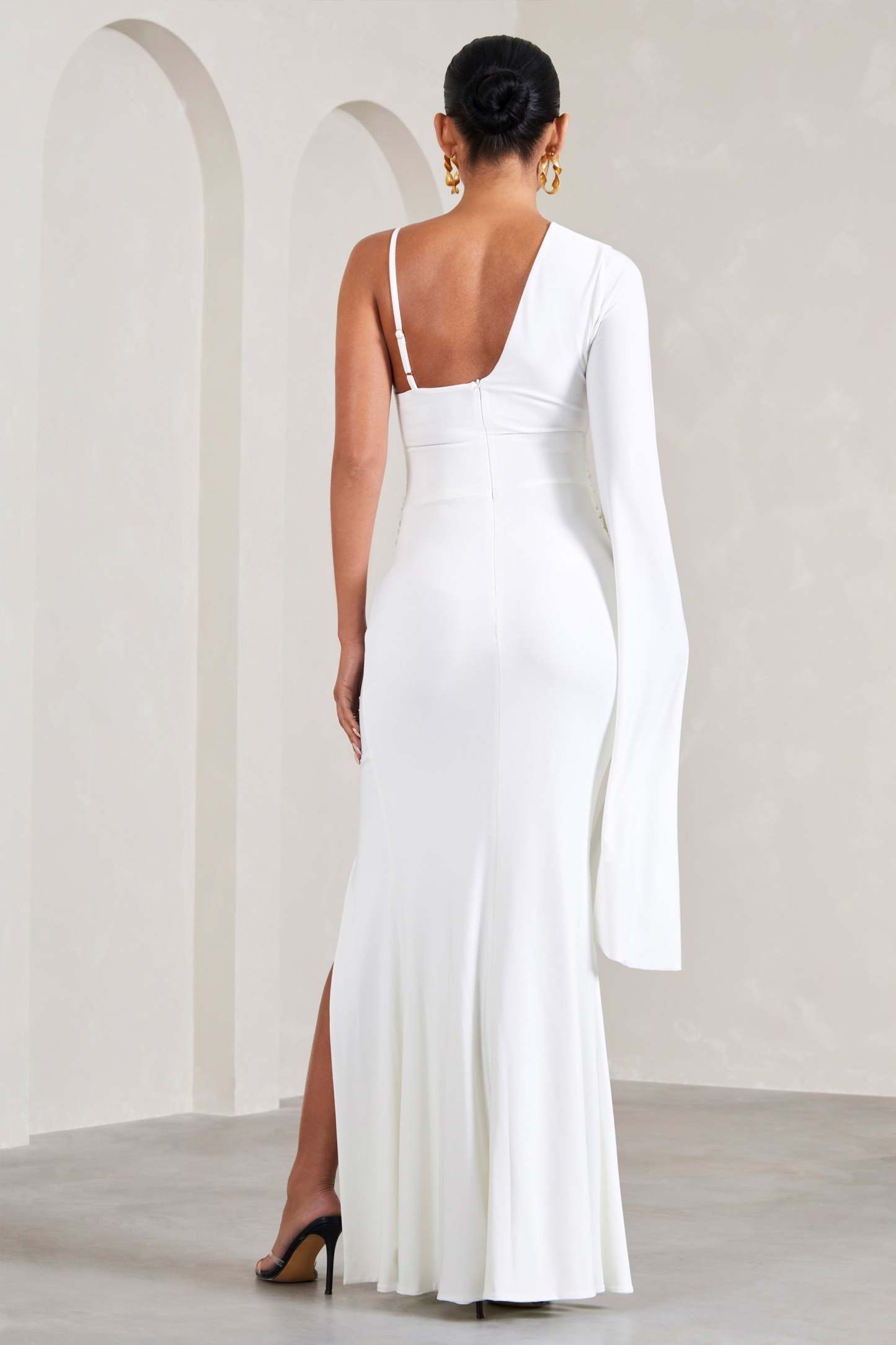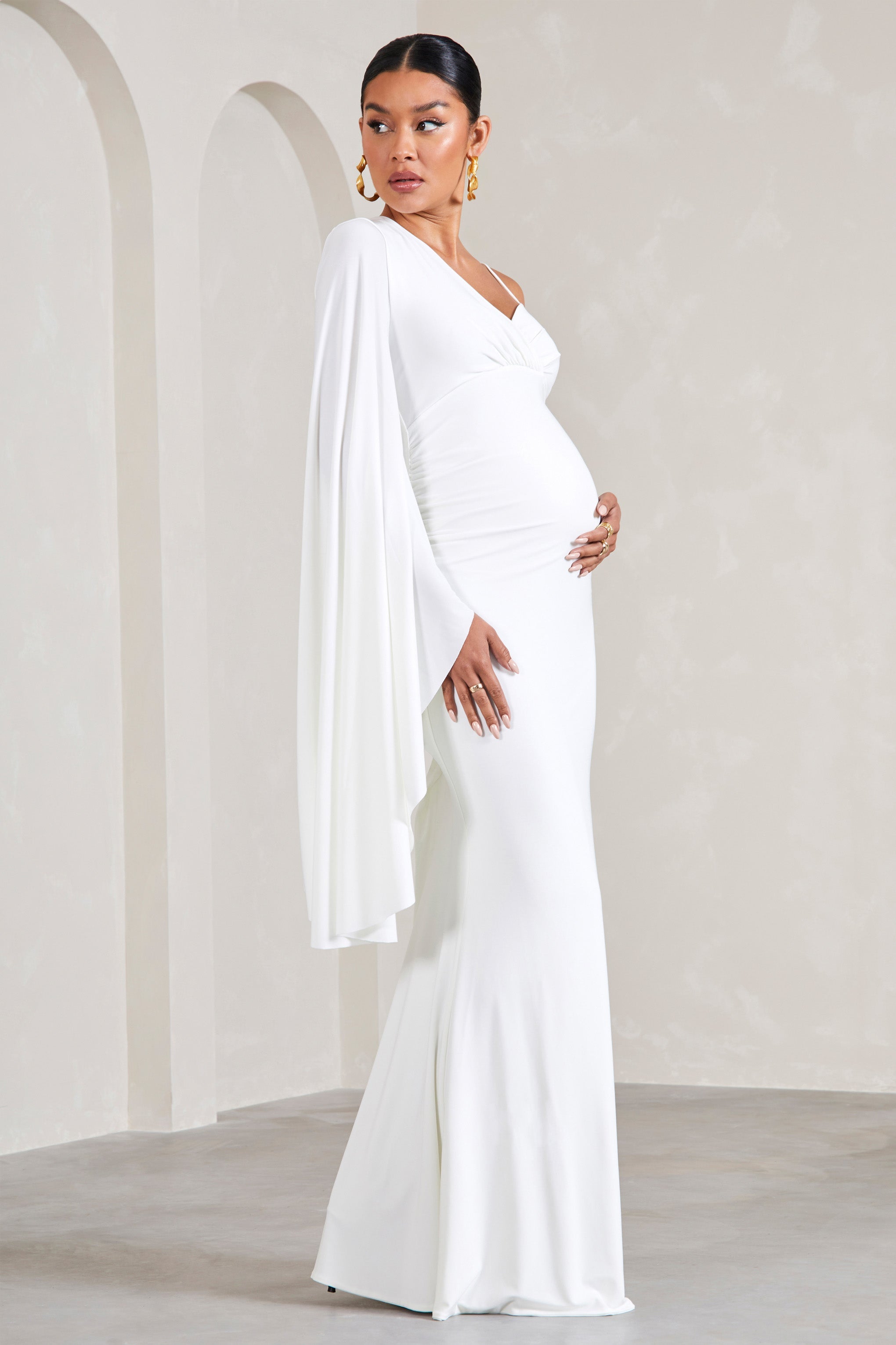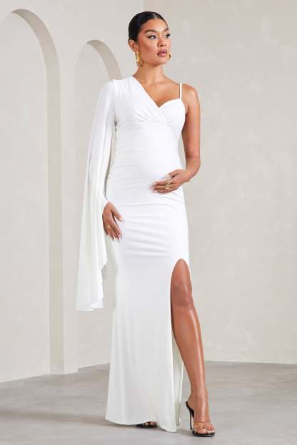 Perfect for baby showers. gender reveals and everything in between. Rhea is a formal wardrobe must-have. Crafted in a crisp white shade of our signature stretch jersey. this v-neck maternity maxi dress was designed with your comfort at the forefront. Characterised by a singular cape sleeve. Rhea concludes with subtle bump ruching and a high-leg split.
