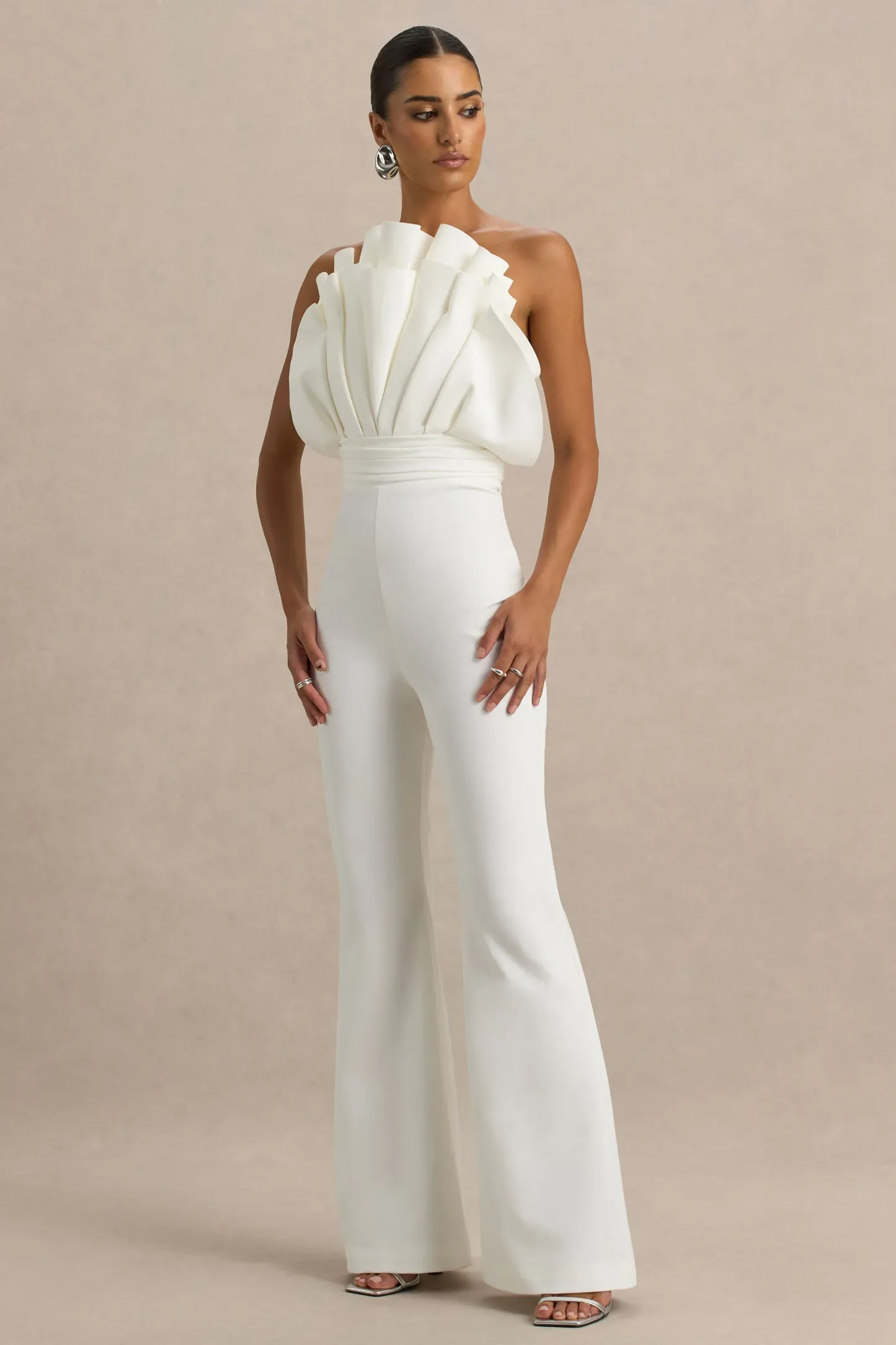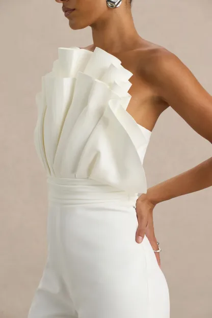 Make a striking entrance in Riga. the definition of modern elegance. This jumpsuit is crafted in a classic white shade of our premium stretch crepe. providing a figure flattering fit that enhances your silhouette. The asymmetric neckline and ruffled bodice add a perfect blend of modernity and romance to this structured piece. that'll capture the attention in any room. Style Riga with a sleek up-do and gold accessories. for a look that is utterly captivating.