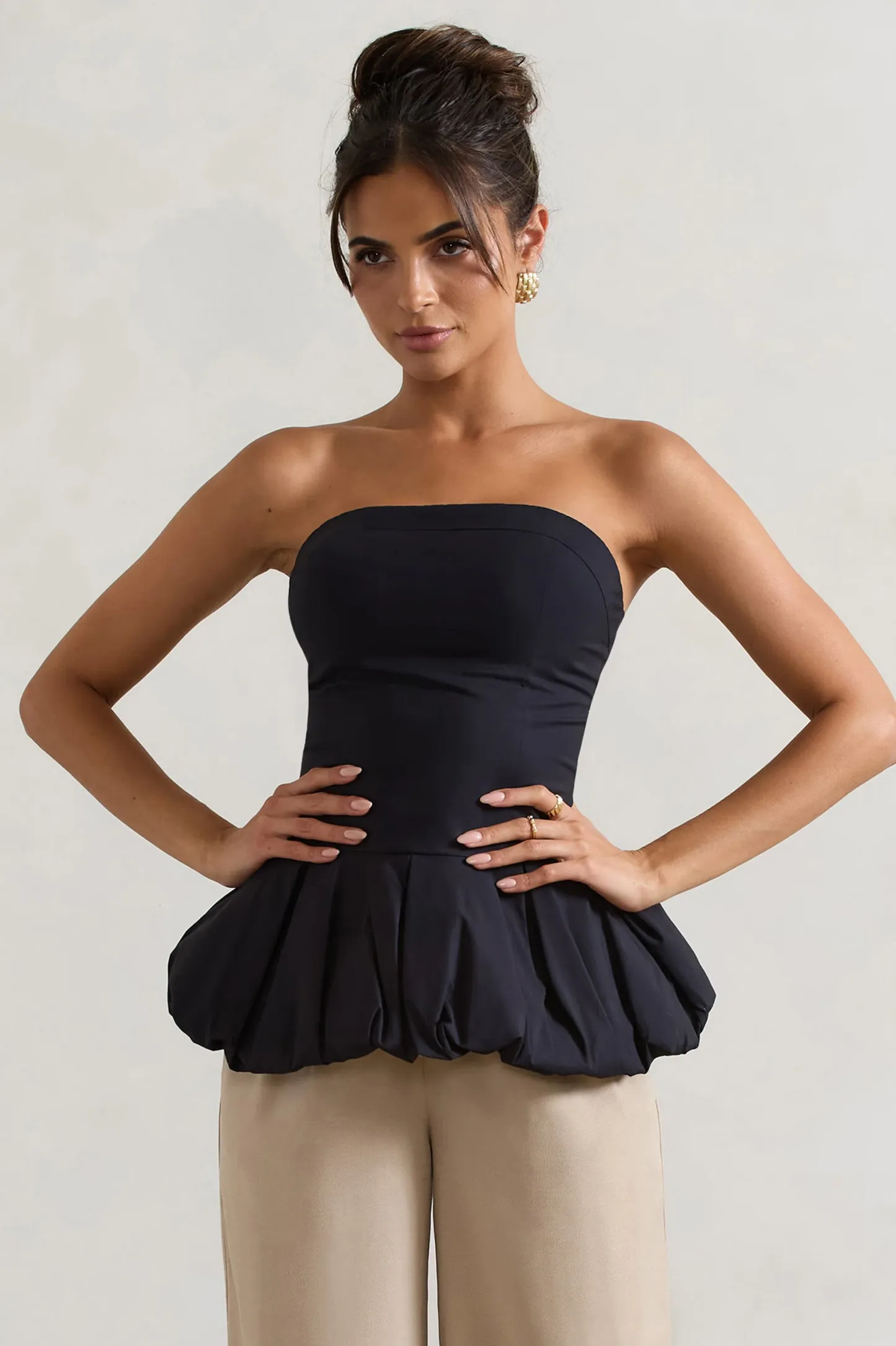 A stand-out staple. our Roll With It top was made to see you through any occasion. Crafted in a premium stretch gingham in a classic black shade. this strapless piece hugs the bodice before finishing with a voluminous peplum hemline.