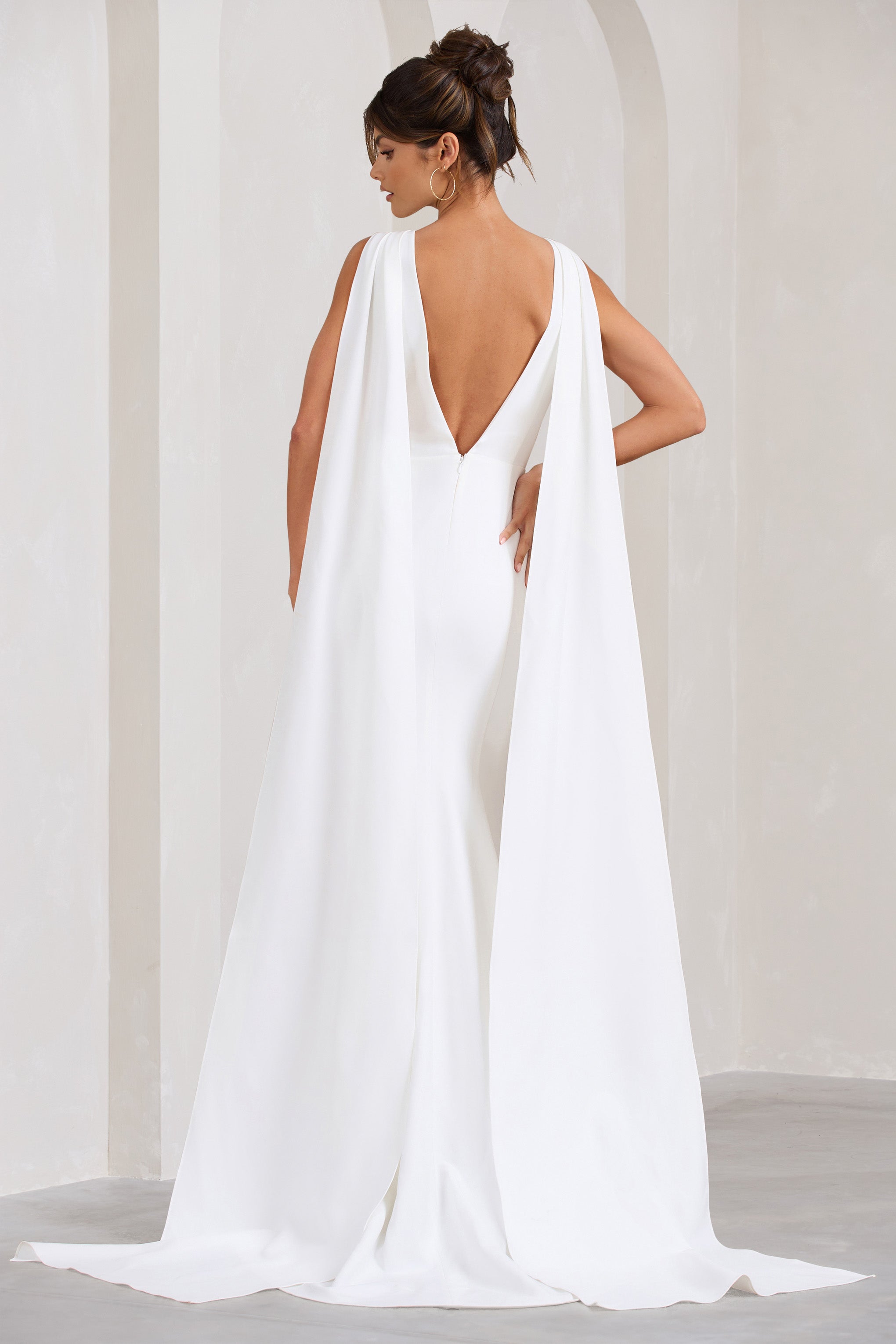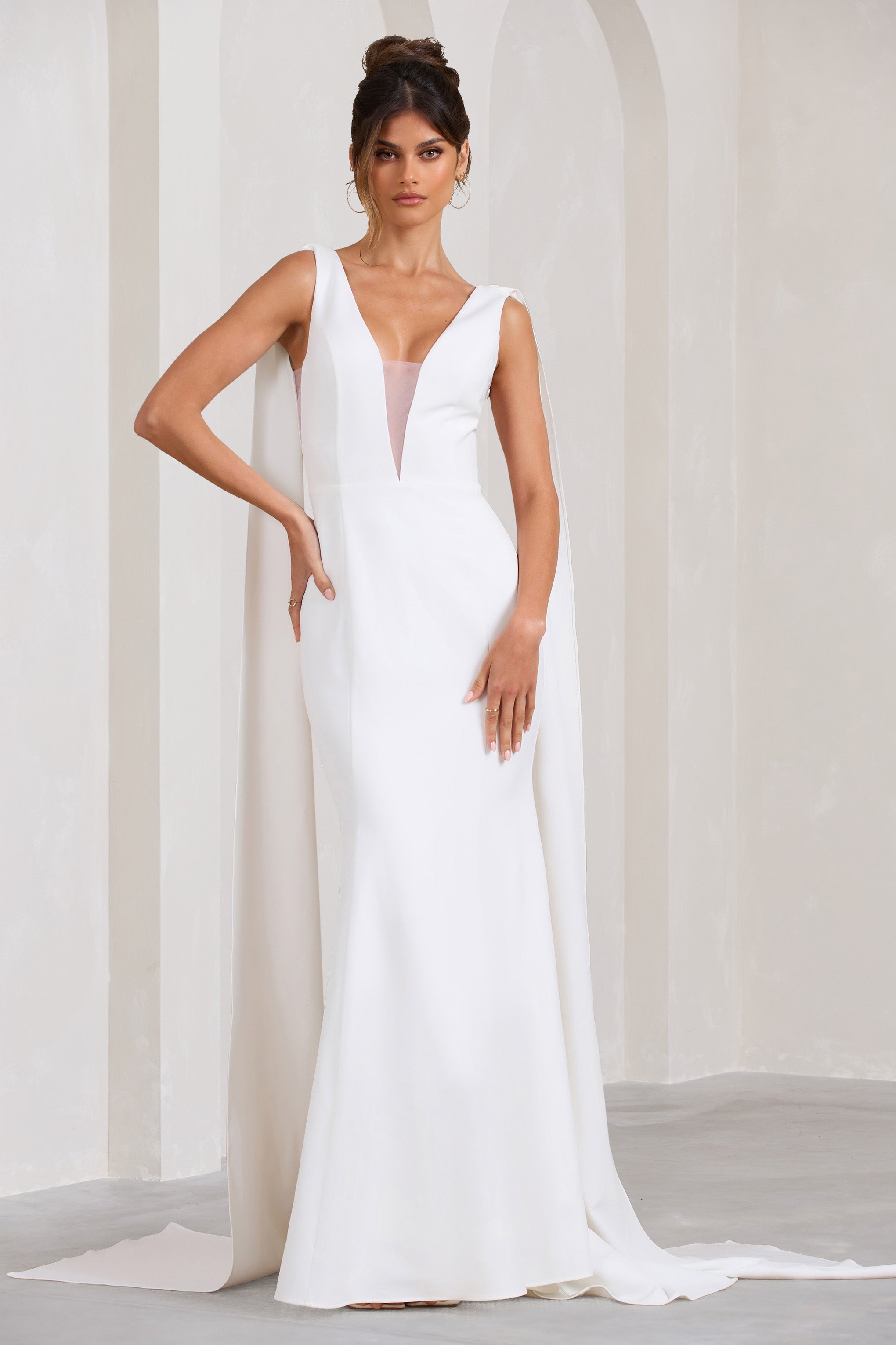 Rosaline White Plunging Fishtail Maxi Dress With Cape
