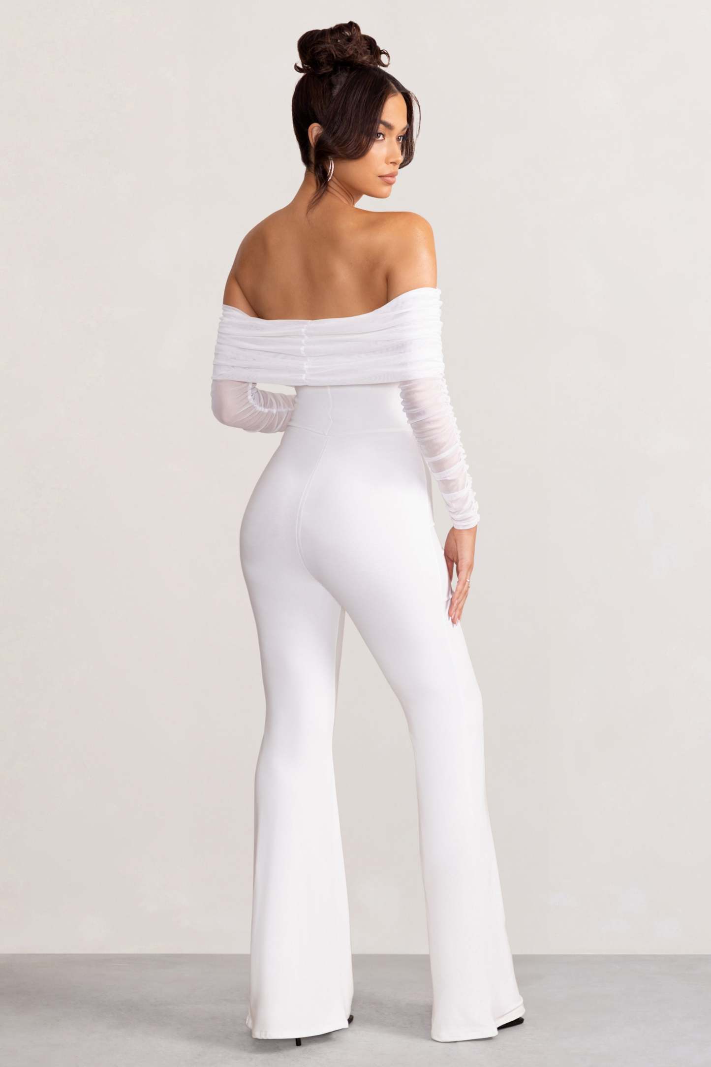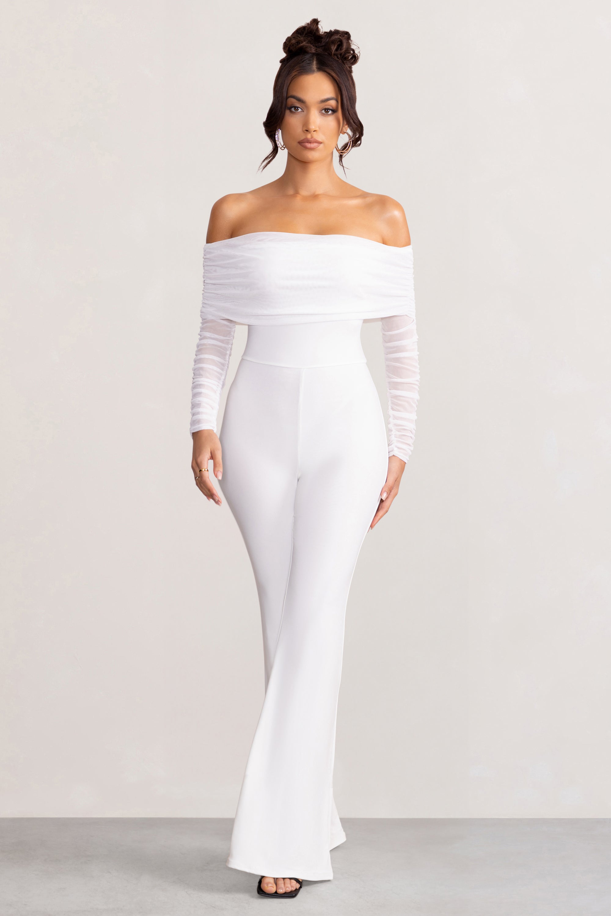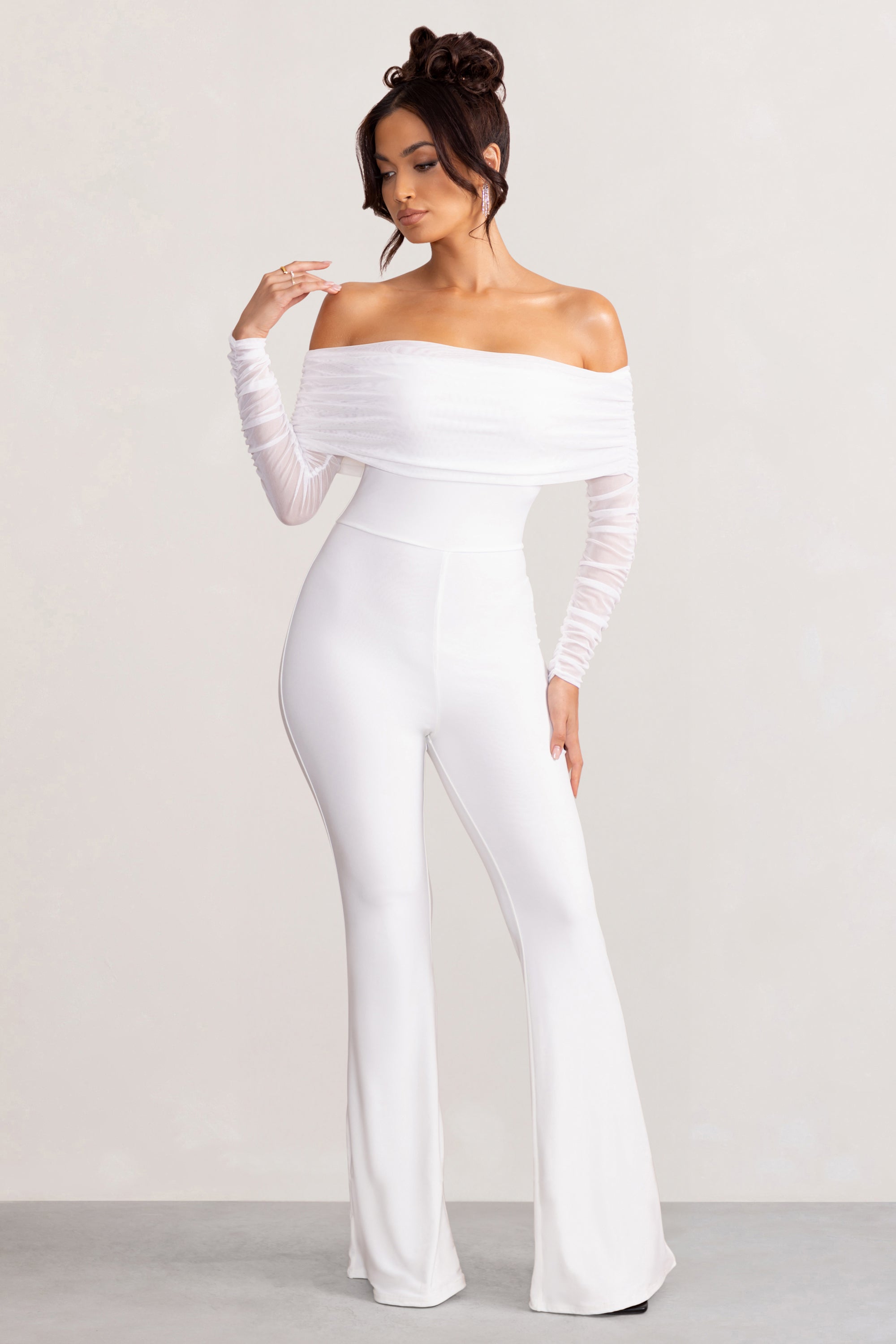 Every Club L design is made to celebrate the feminine figure and our latest jumpsuit Whisper is certainly no exception. Crafted from premium white jersey and wrapped in layers of delicately ruched mesh. this flattering playsuit features a Bardot neckline. long sheer sleeves and flared legs that catch every curve. From birthday drinks to bachelorette nights. Whisper is a jumpsuit for any special occasion you have upcoming.