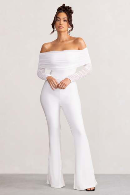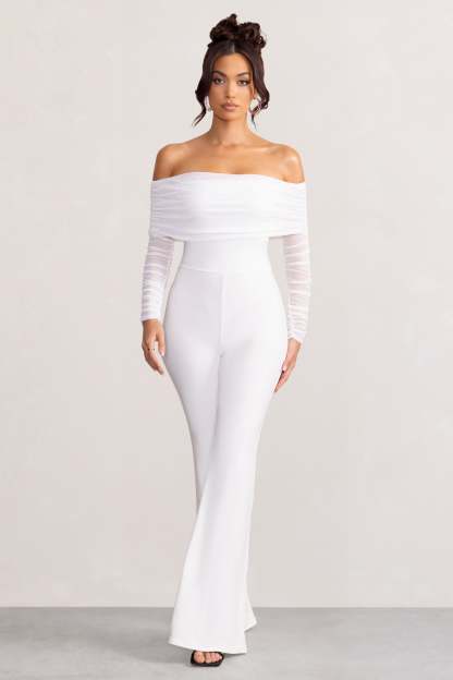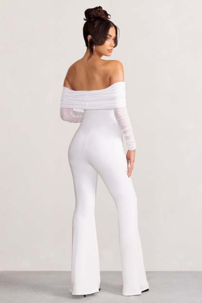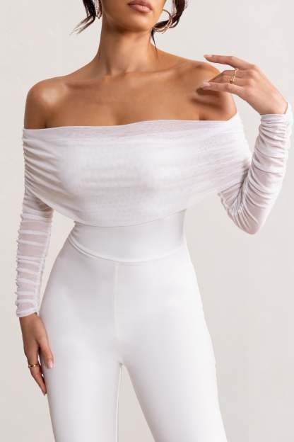 Whisper White Ruched Mesh Bardot Jumpsuit