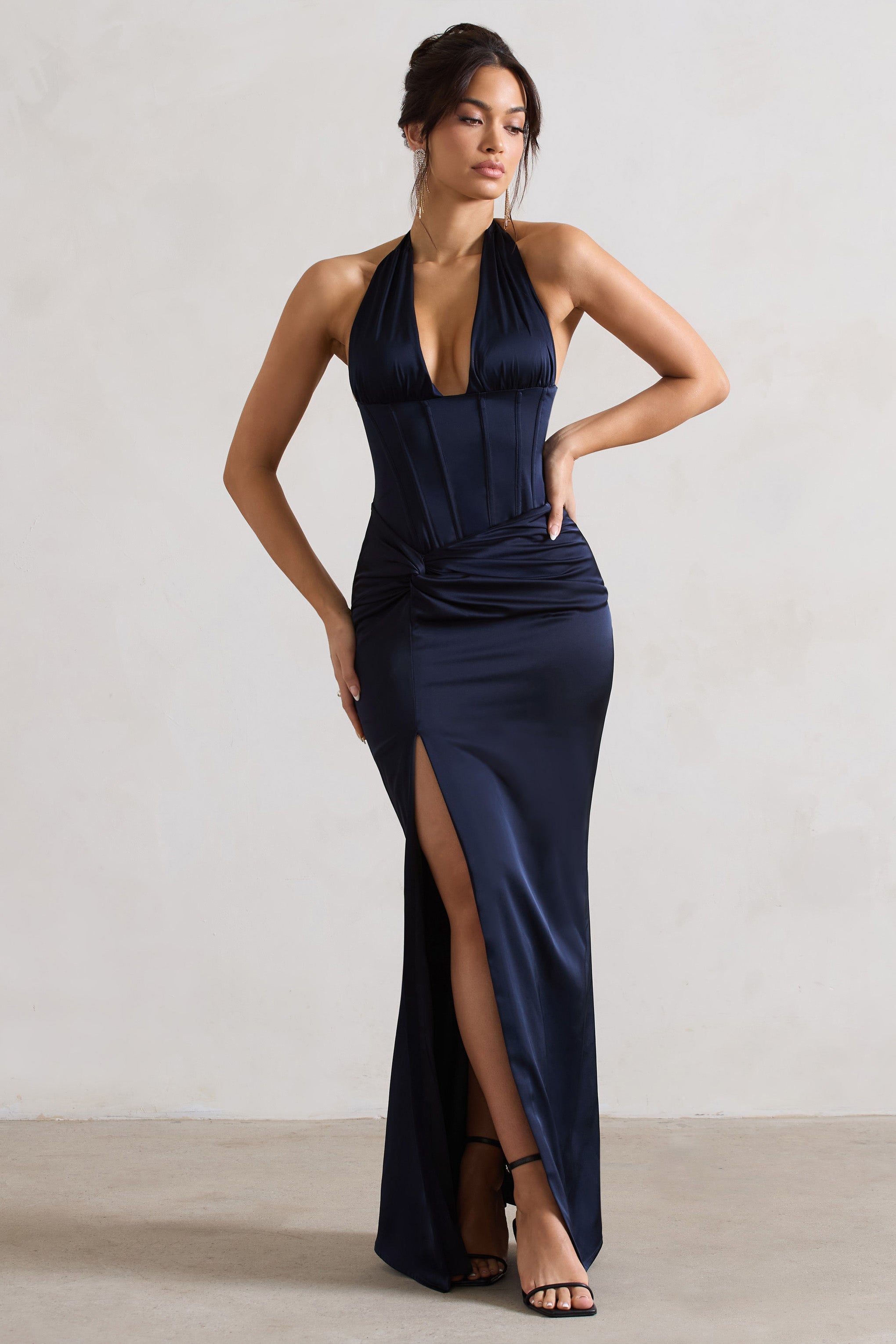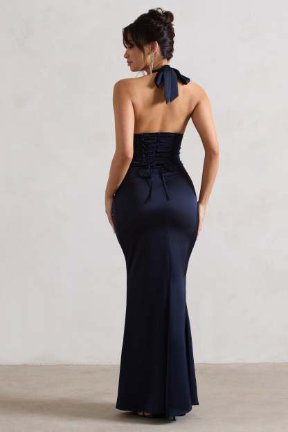 Made in a premium satin fabric to fit you like a glove. this navy maxi dress is as flattering as it is flawless. Sacha boasts a boned corset bodice thats highlighted by a self-tie halter neckline and sculpting lace up back. Flourished with a twisted knot detail placed below the waist. this alluring piece has so many details to fall in love with.