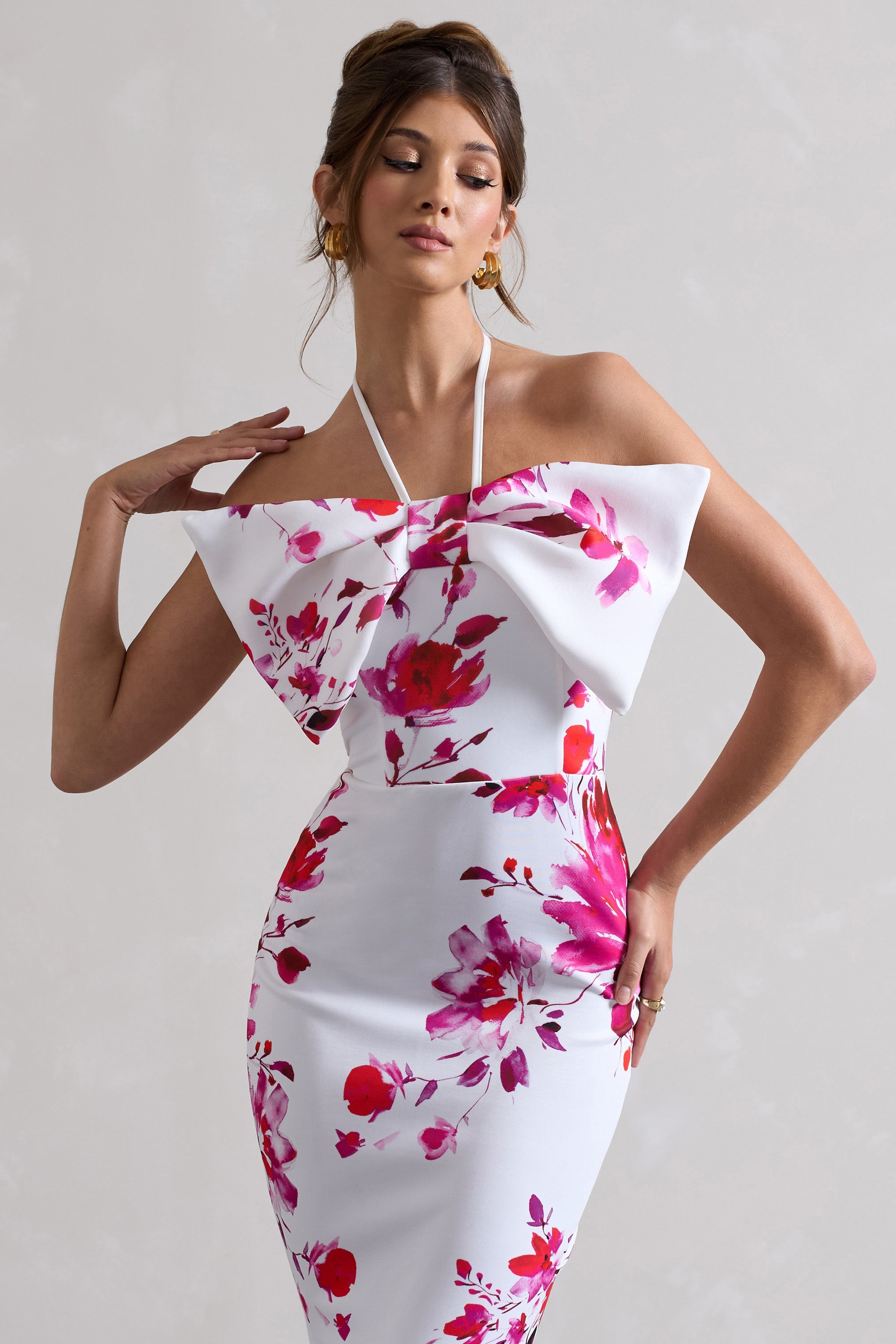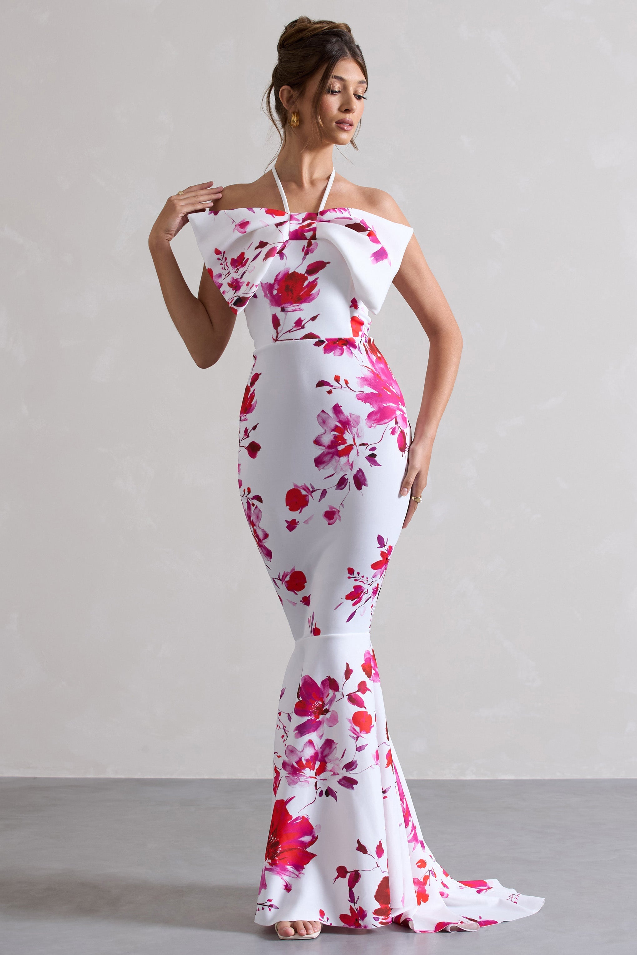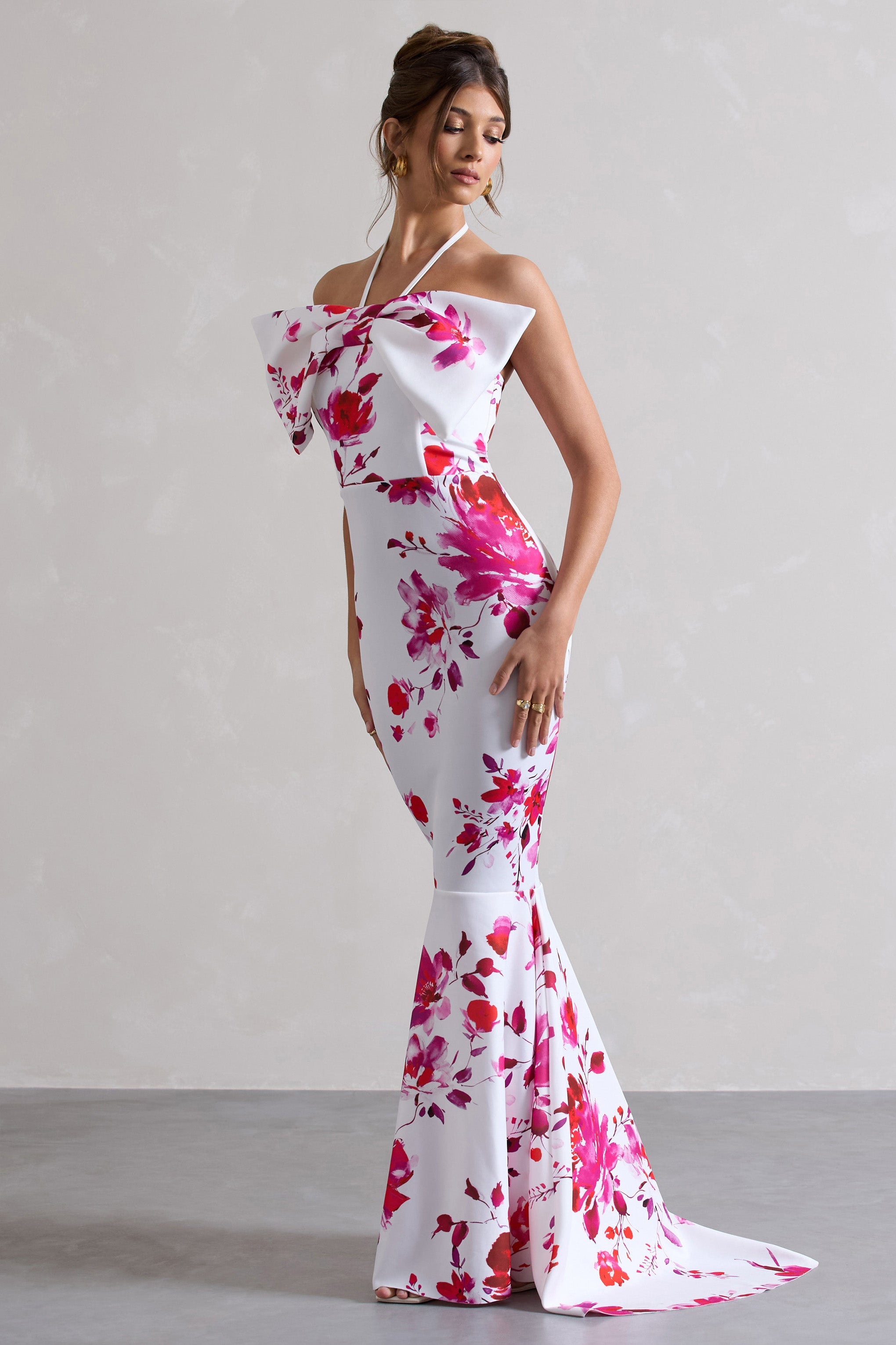 Get the perfect ladies day look this race reason in Sakura. This stunning fishtail maxi has been expertly cut in our premium scuba crepe in a bright pink floral print. Defined by an eye-catching bow and delicate self-tie halter. show off all this statement dress has to offer by styling Sakura with a tousled bun.