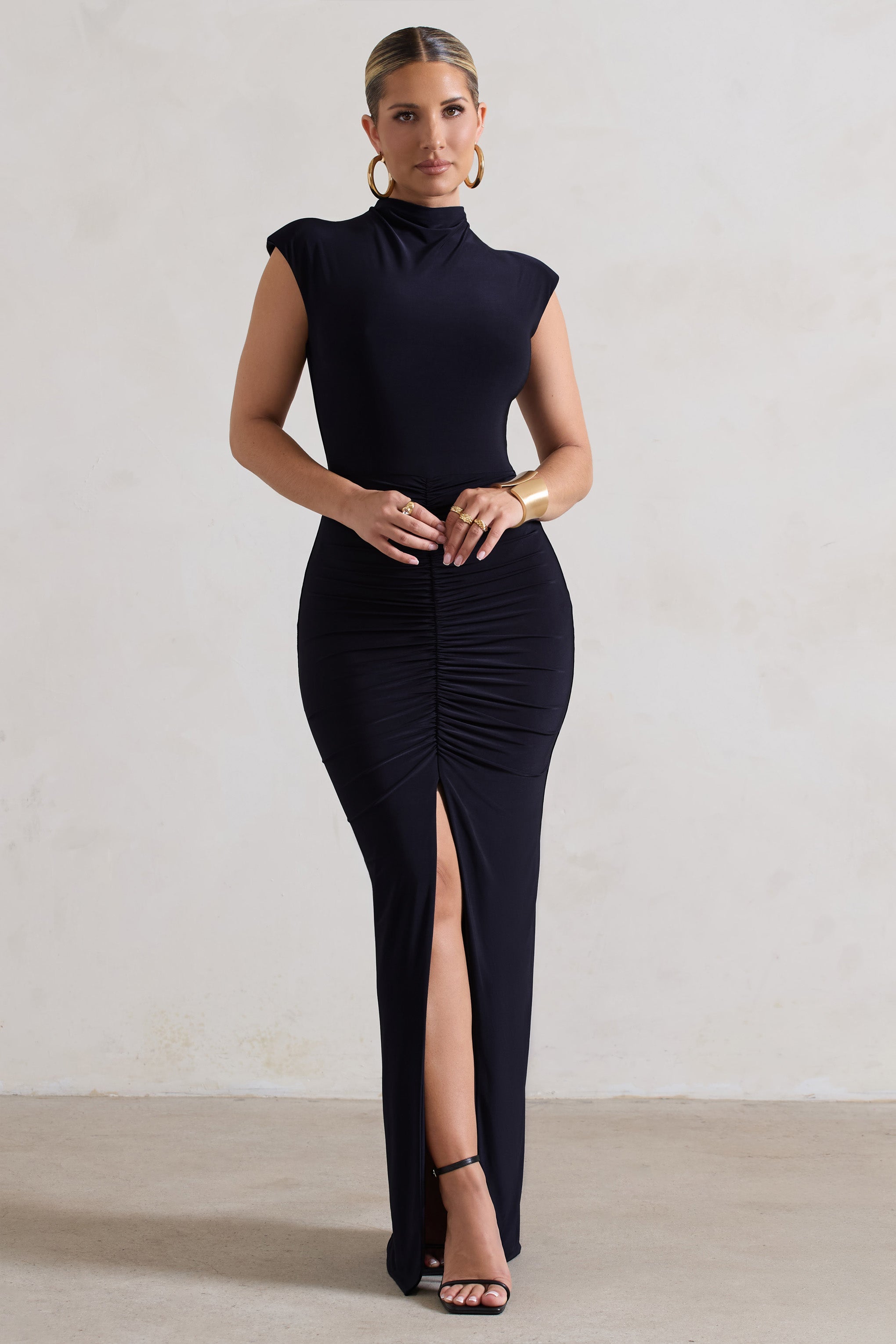 Samira Navy Ruched High-Neck Split Maxi Dress