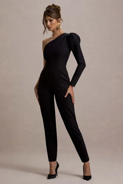 Black One-Shoulder Puff-Sleeve Jumpsuit
