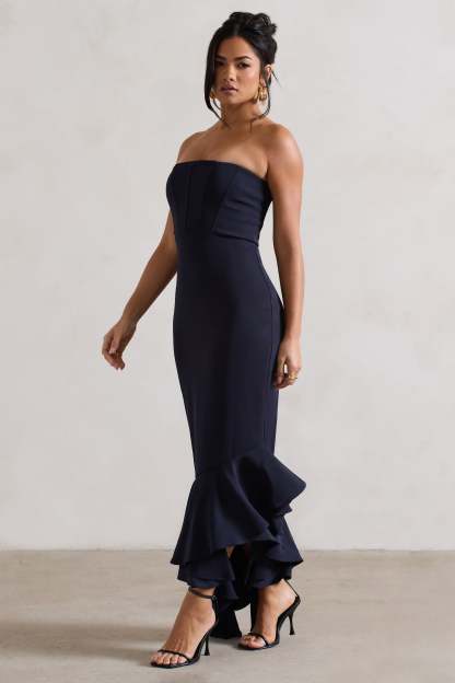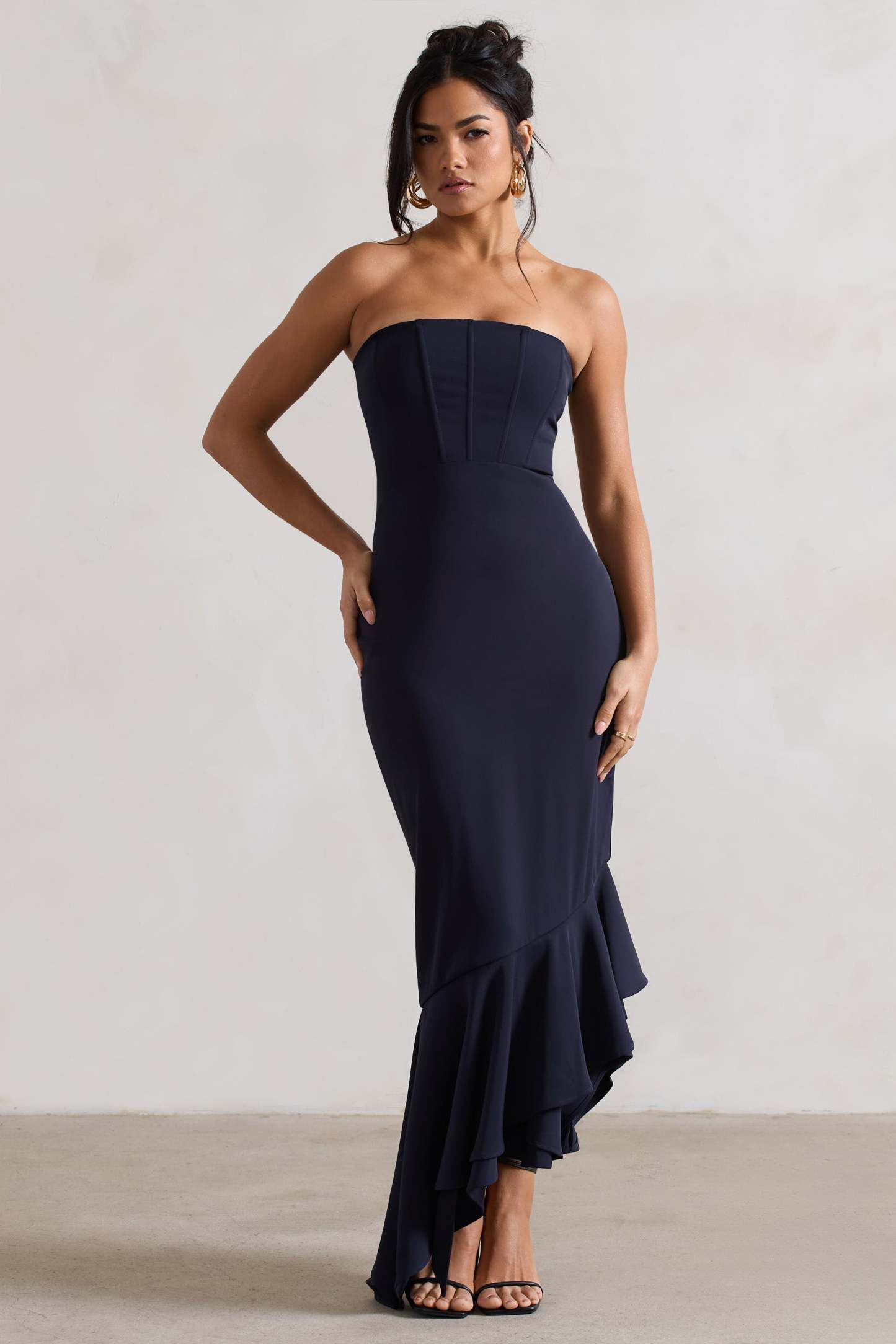 Say hello to Sandy. our strapless maxi perfect for any formal occasion. Crafted in a rich navy shade of our sculpting premium crepe. this form-flattering bodycon is detailed by its delicate asymmetric ruffle hem. Try pairing Sandy with our Lush shawl for the ultimate wedding guest look.