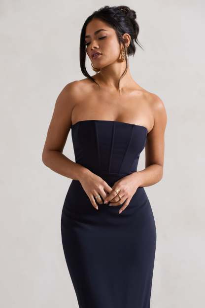 Sandy Navy Strapless Corset Asymmetric Maxi Dress