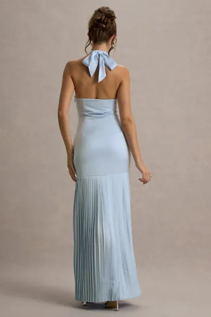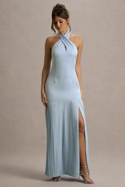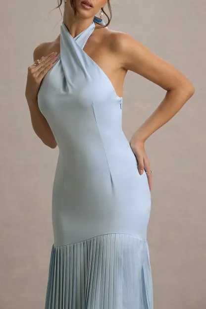 Powder Blue Satin Cross Halter-Neck Plisse Maxi Dress