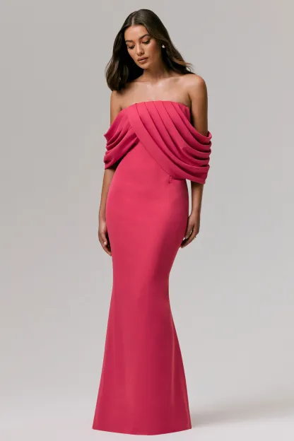Step into timeless sophistication with Serene. a gown designed to leave a lasting impression. Crafted from a hot pink shade of our premium stretch chiffon and crepe. this maxi is the definition of graceful elegance. Featuring a romantic bardot neckline and draped sleeves. Serene flatters with every movement. The internal corset sculpts your silhouette for a flawless fit. making it the perfect choice for black-tie moments. bridesmaids. or any occasion that calls for timeless glamour.