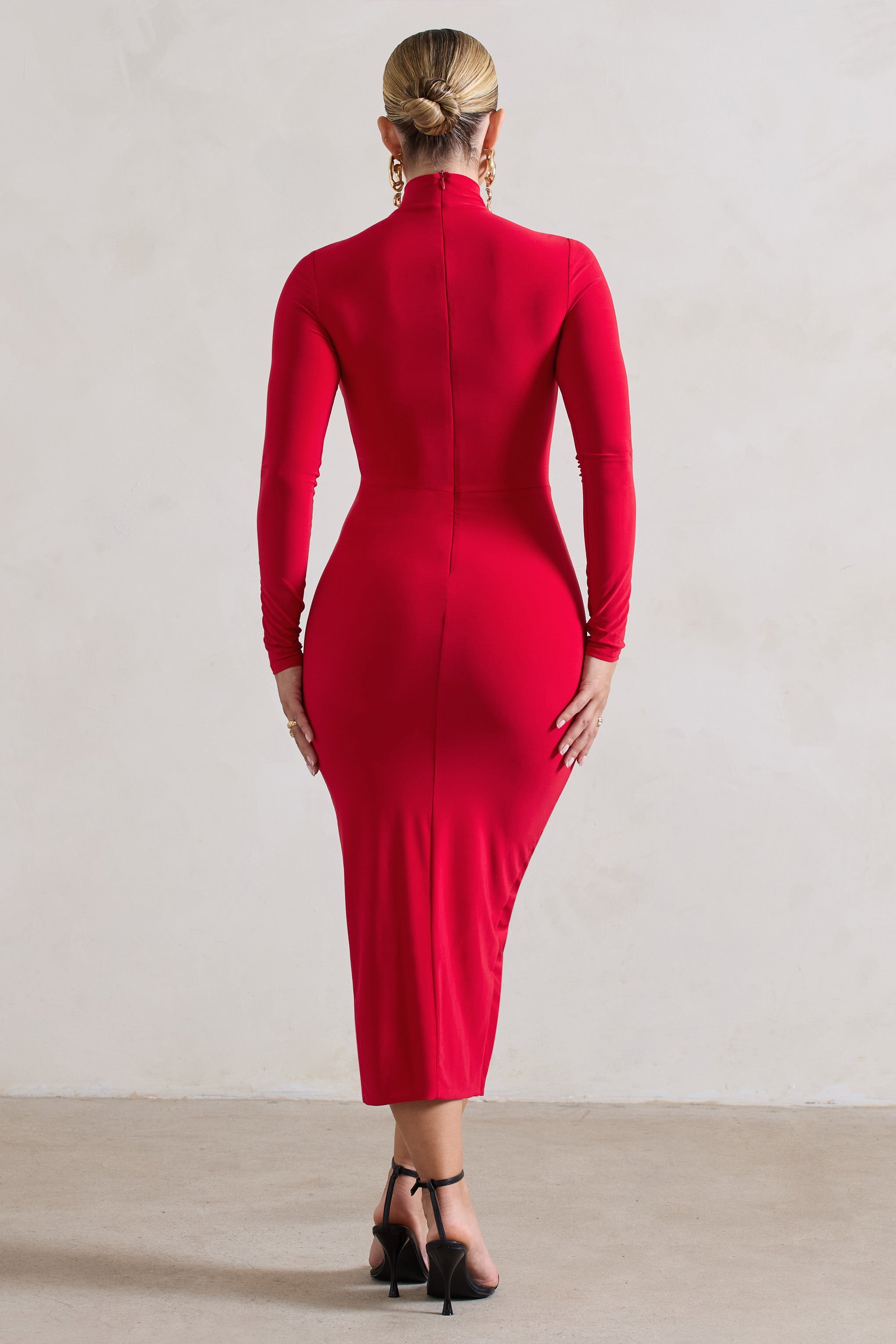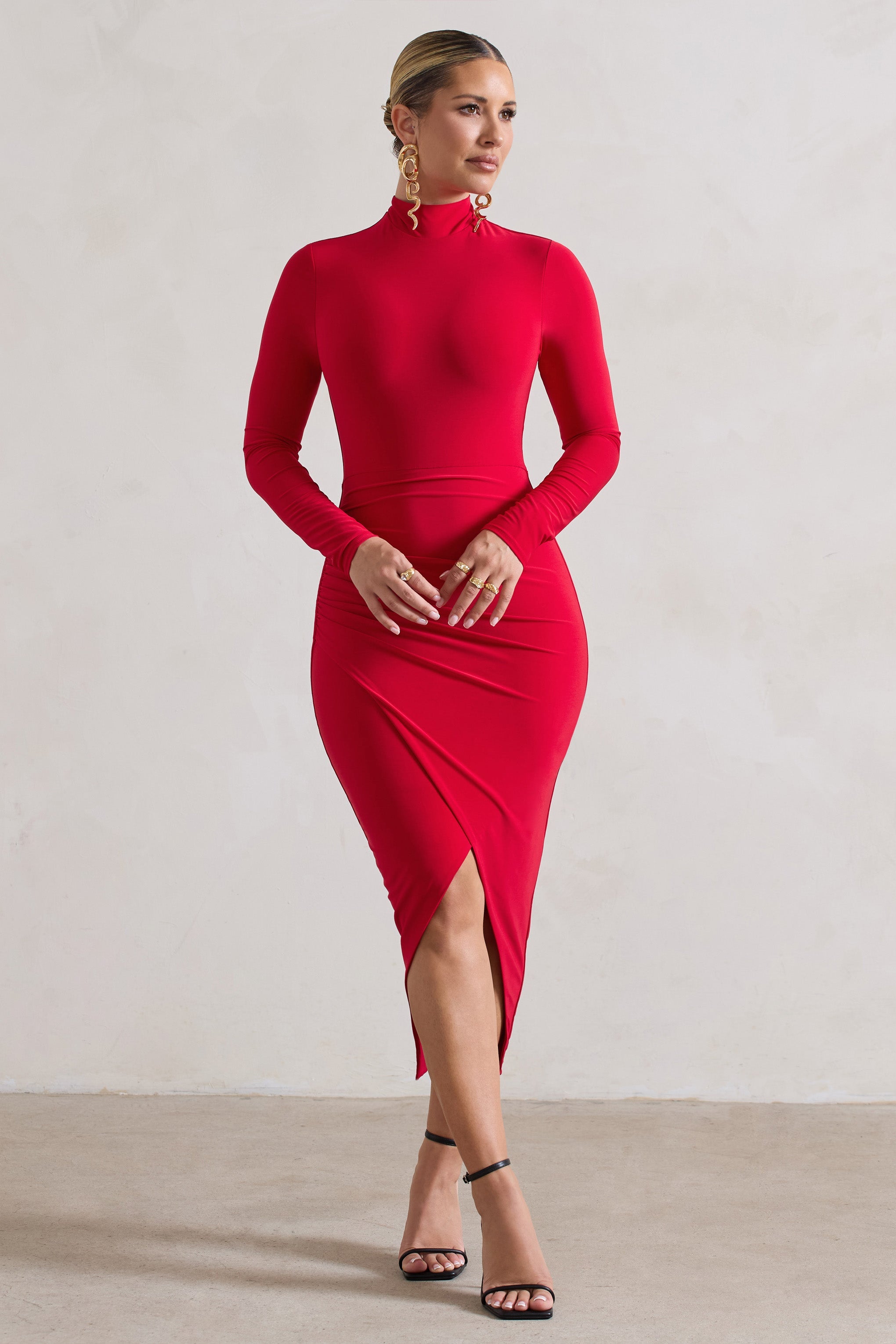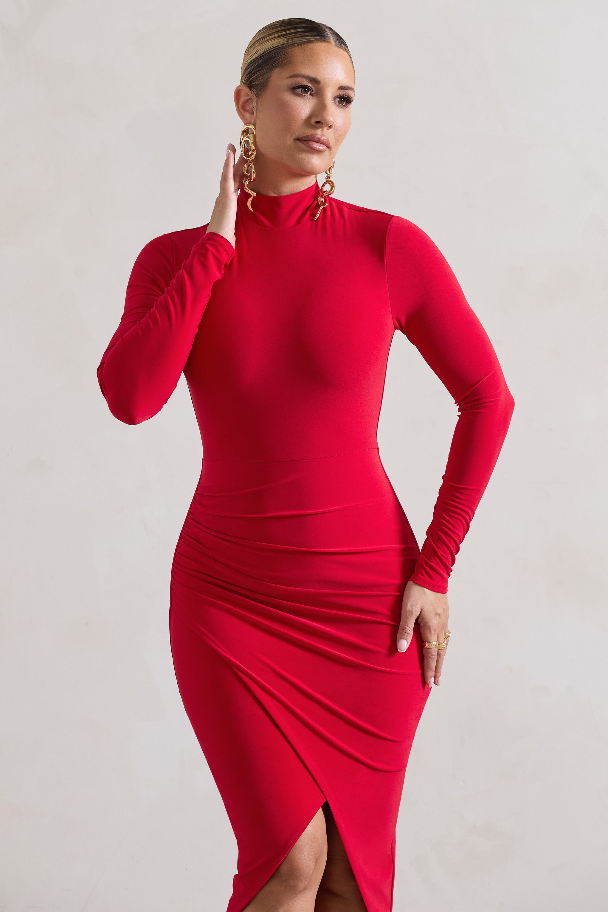 Our Soha dress is fitting for any upcoming occasion on your social calendar. Cut in our premium jersey. this red midi dress is designed to flatter all figures. Soha is defined by a modest high neckline. elegant long sleeves and a curve enhancing gathered wrap skirt. Pair yours with some statement earrings like Eliana and a sleek bun for the perfect occasion look.