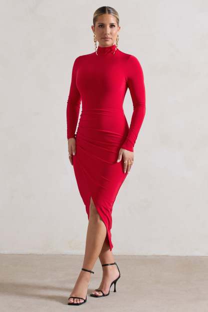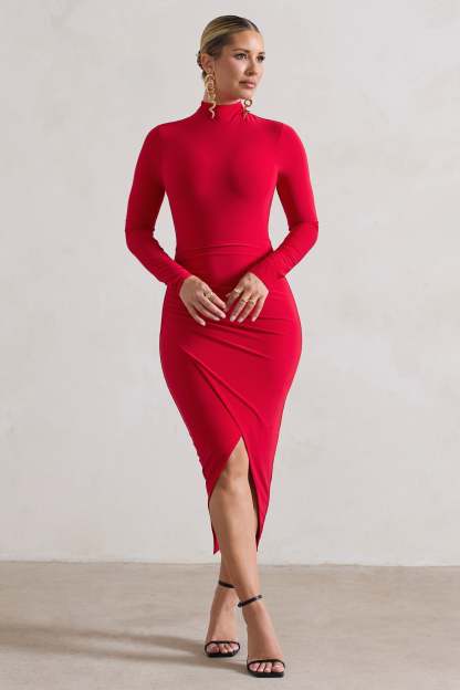Soha Red High-Neck Wrap Midi Dress