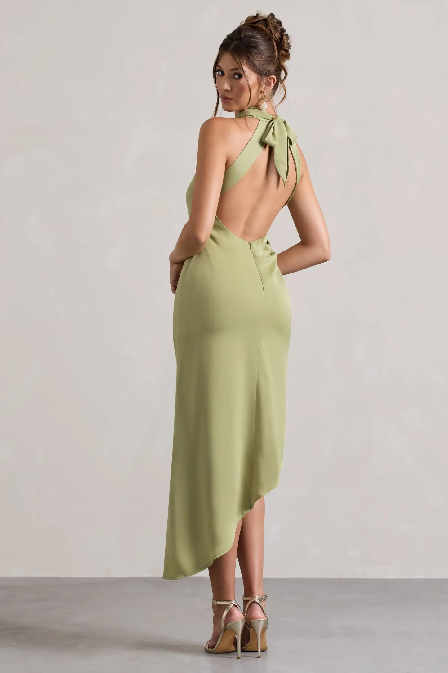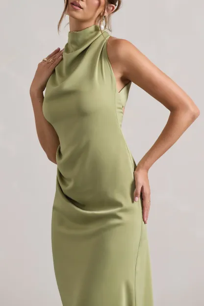 An enchanting style designed for romantic evenings. Sophina is this seasons satin showstopper. Arriving in a soft olive green hue. this midi dress boasts a self-tie cowl neckline. tantalising open-back and artful asymmetric hem.