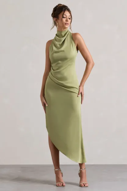 Light Olive Satin Cowl-Neck Asymmetric Midi Dress