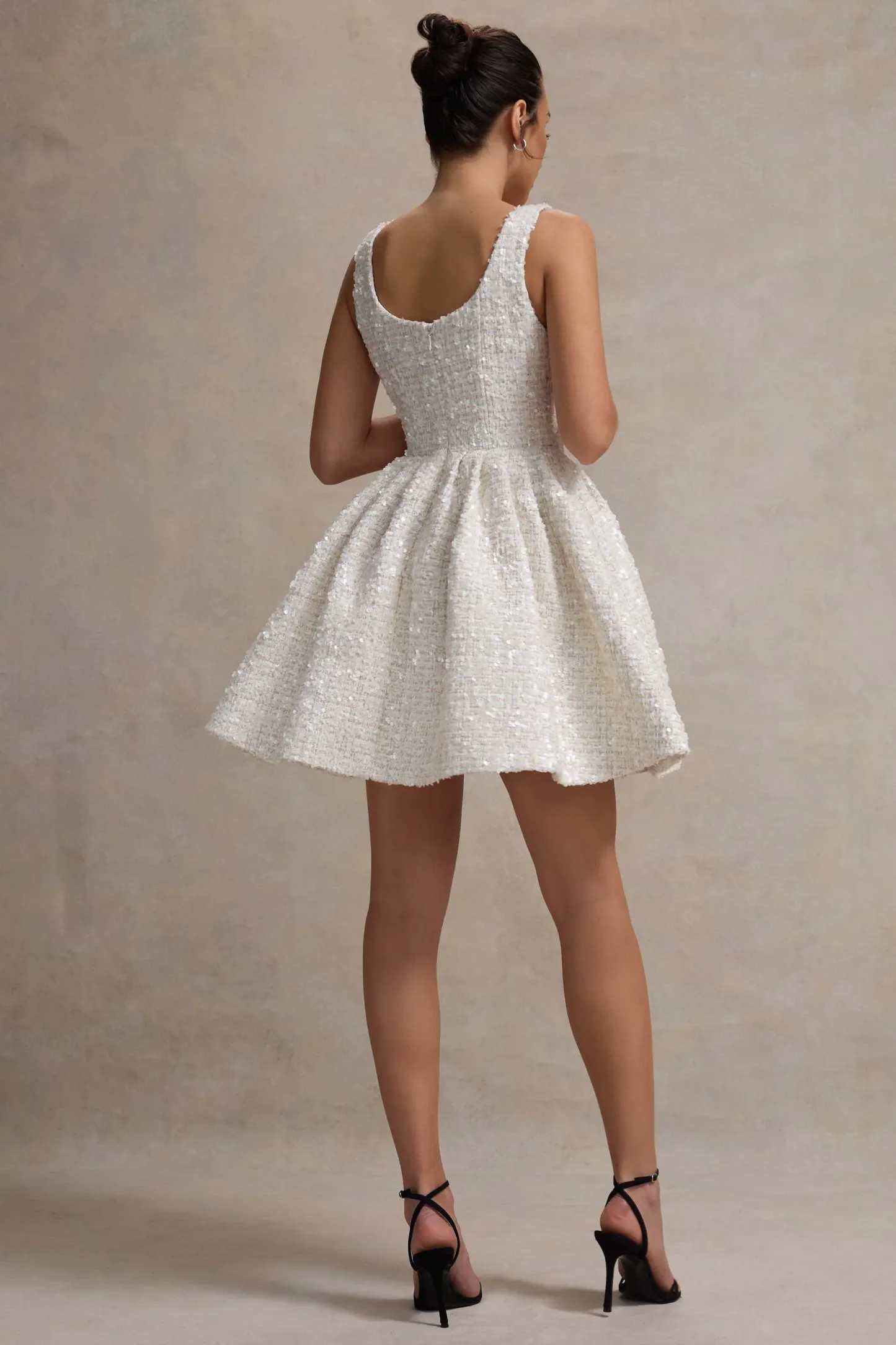 Sweeten up your dress collection this season with the addition of Sugar Plum. our cream mini. Designed in a premium sequinned boucle. this party piece boasts a square neckline. wide shoulder straps and gathered hip panels that accentuate your natural curves.