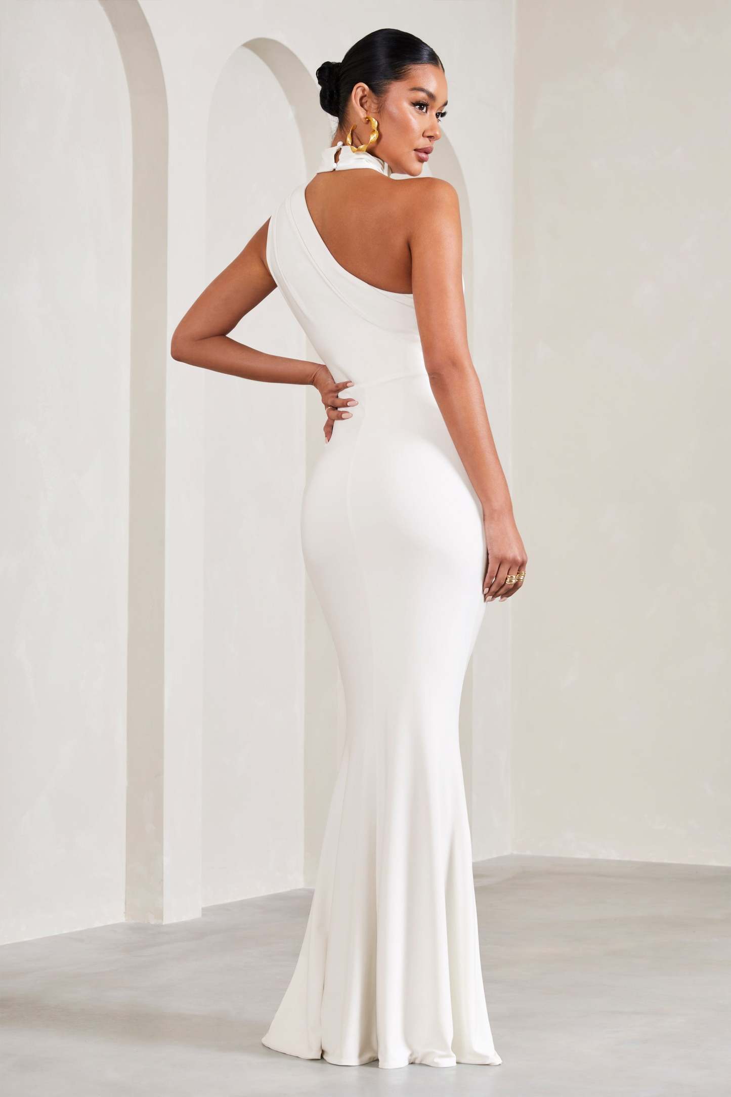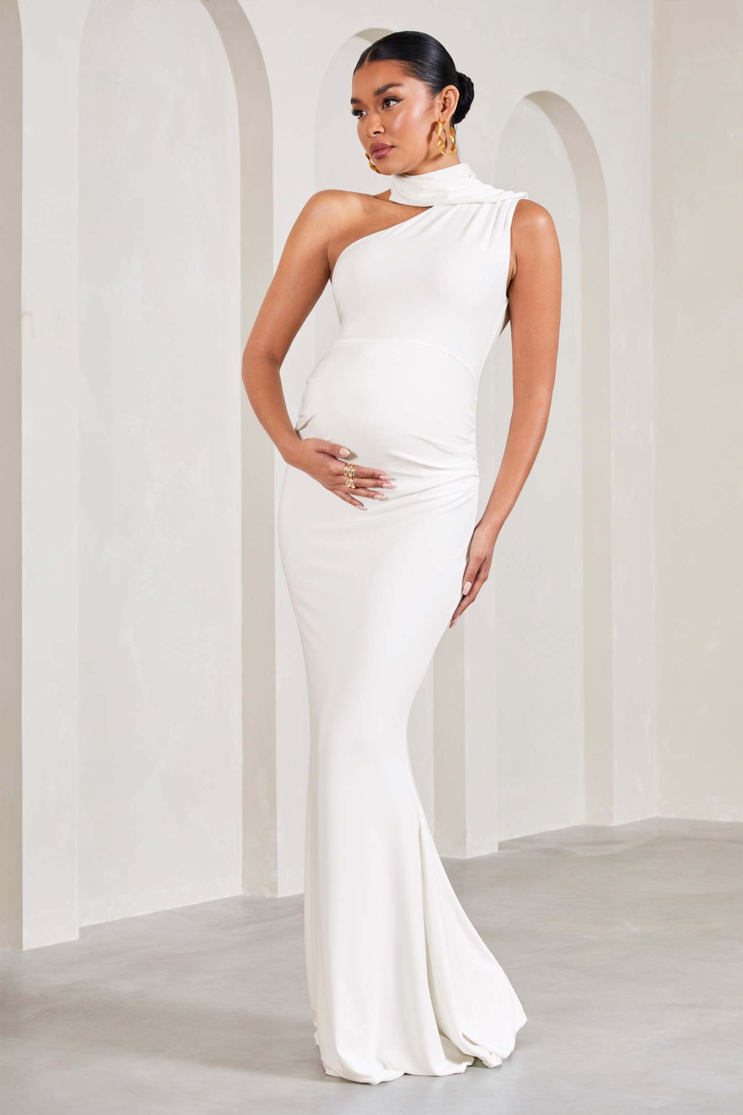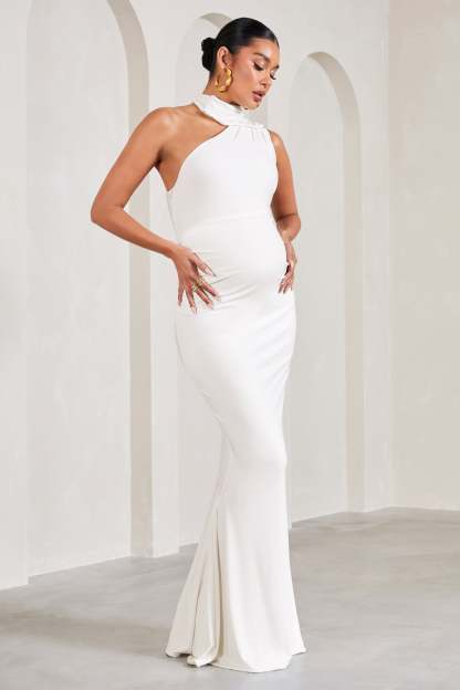 Add a touch of elegance to your maternity wardrobe this season with our asymmetric maxi dress Sylvia. Crafted in a white shade of our premium stretch jersey. this form-flattering piece arrives with a wrap-collar detail. supportive bump ruching and floor-length skirt. For the perfect race day ensemble. try pairing Sylvia with some strappy stilettos and a sleek bun.