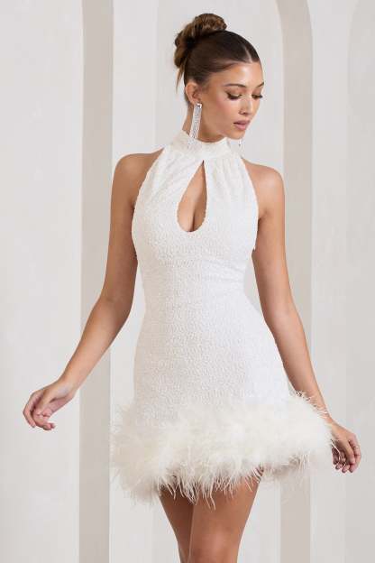 Tillie White Sequin High Neck Trapeze Mini Dress With Feather Hem Detail