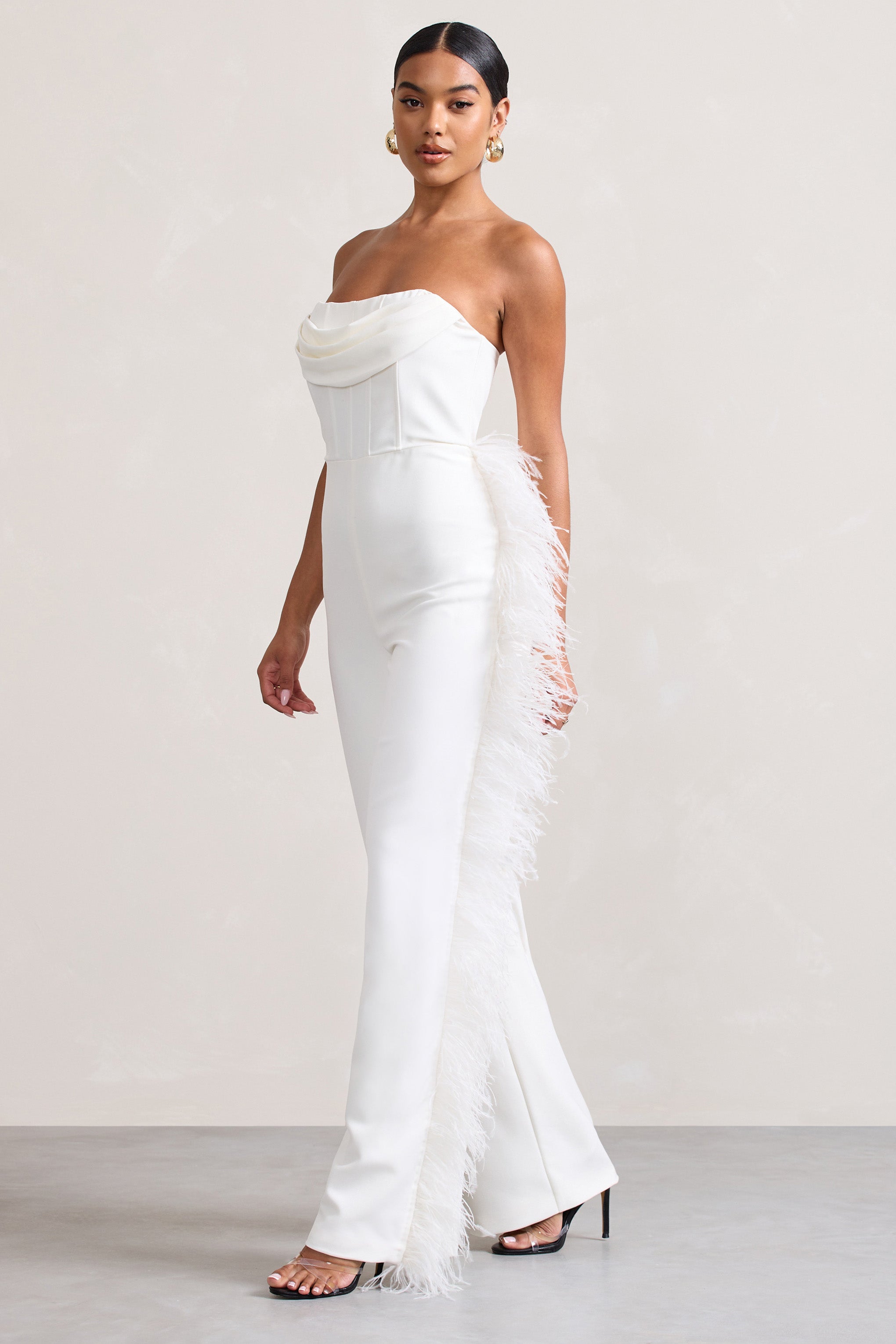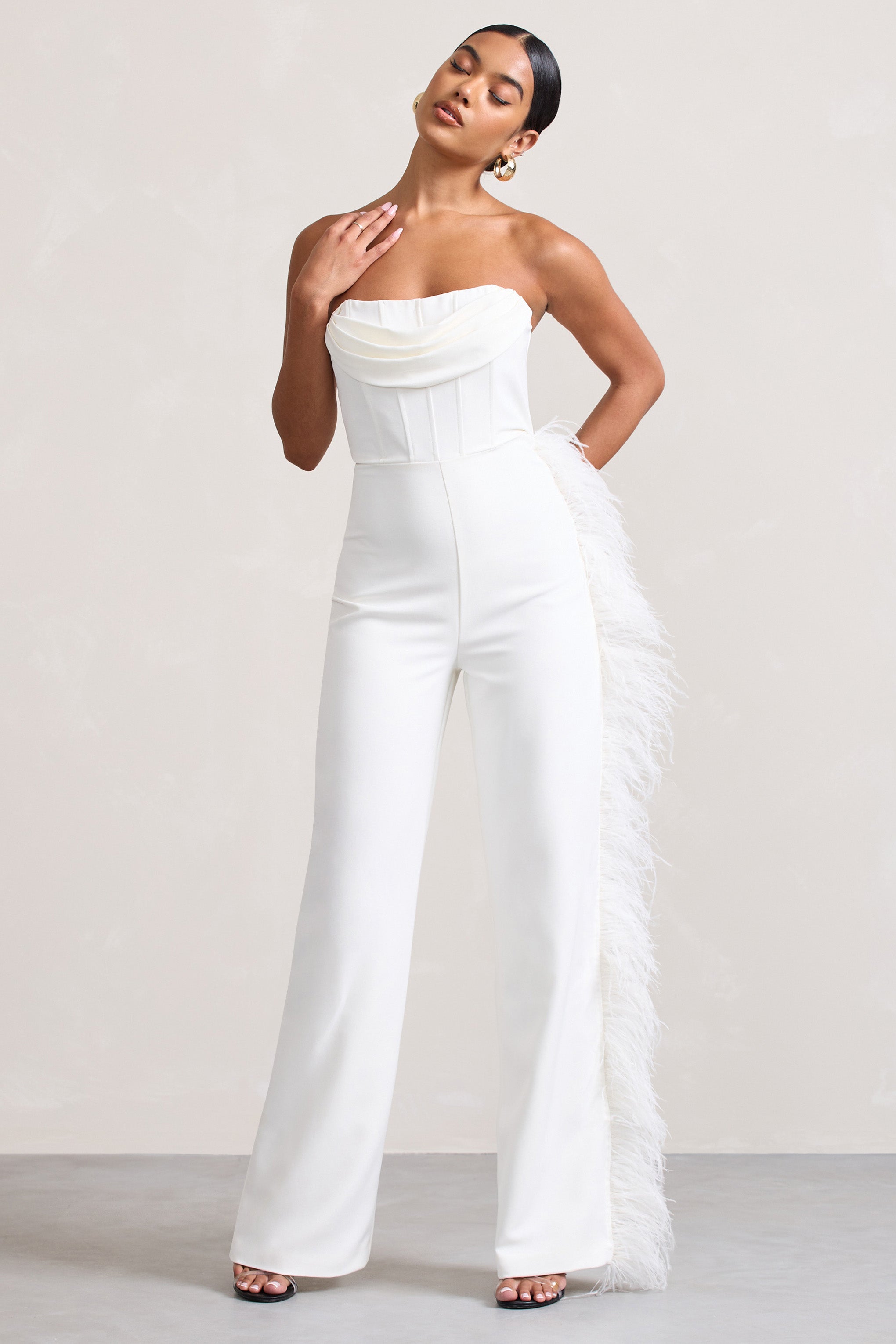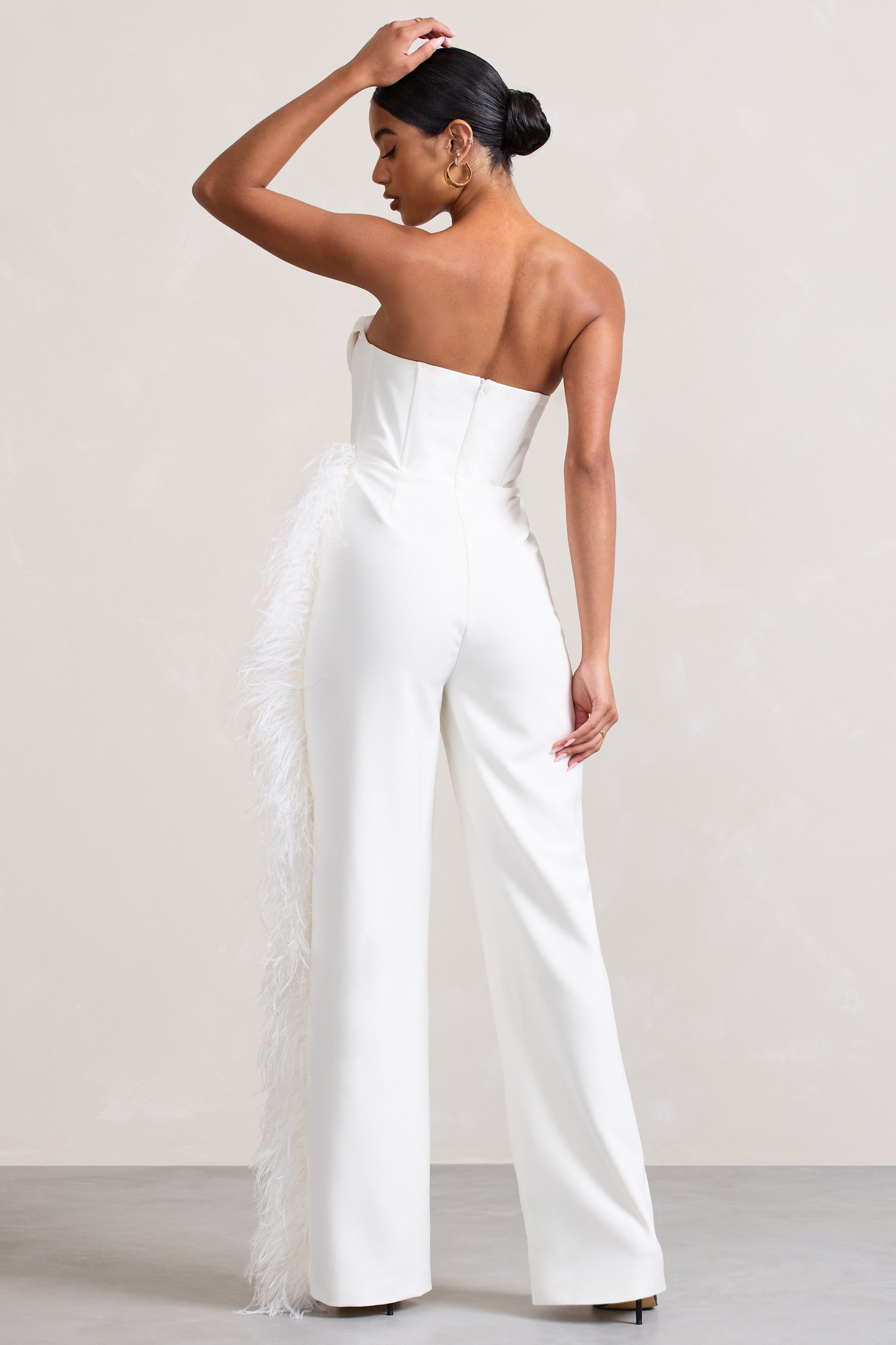 Topic Of Talk White Strapless Bandeau Wide-Leg Jumpsuit With Feather Trim