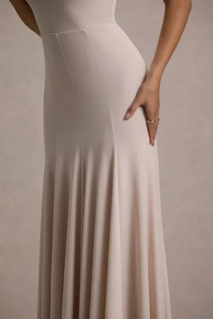 Exude effortless elegance in Ulani. our captivating maxi dress. Arriving in a soft champagne shade of our premium soltan fabric. this floor-sweeper is defined by a demure high neckline and sultry open back highlighted with dainty adjustable straps. Go for maximum impact at your next event and style yours with some sparkling accents like Bond.