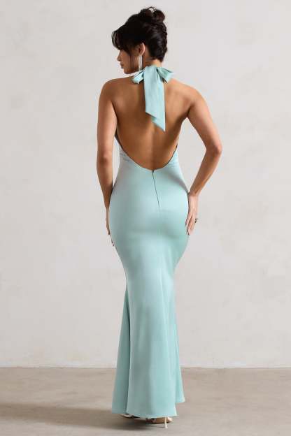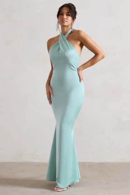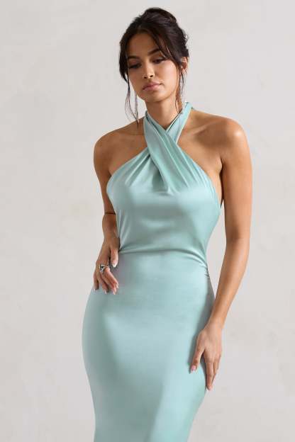 Exude confidence at your next event in this show-stopping maxi. Unbeatable. Arriving in a soft mint green hue of a premium satin. this backless piece features a cross over halter-neck thats finished with wide self-tie straps for the perfect custom fit. For an elegant bridesmaid attire. try styling yours with our Just A Fling court shoes.