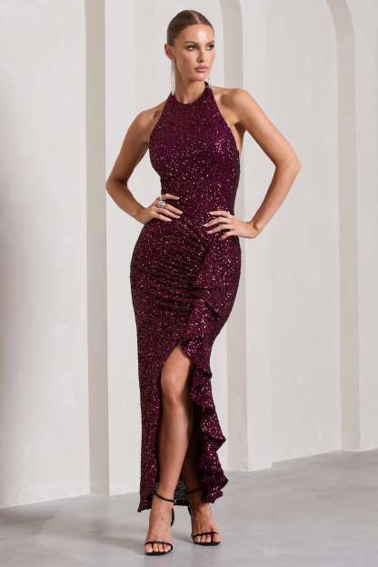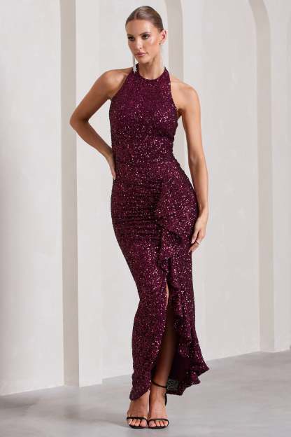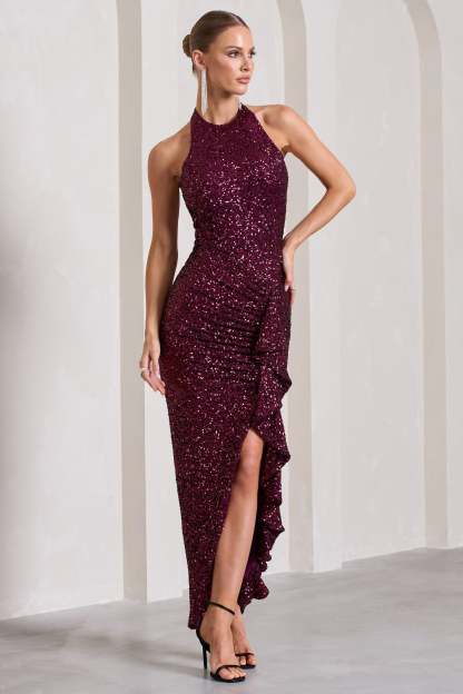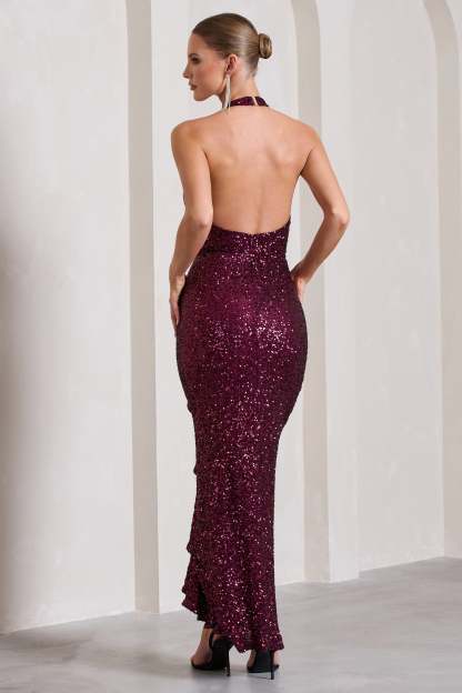Under The Stars Plum Sequin High-Neck Open-Back Maxi Dress With Drape