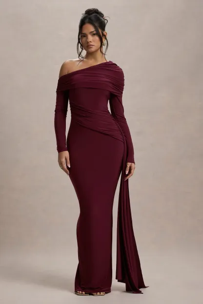 Burgundy Ruched Asymmetric Maxi Dress With Drape