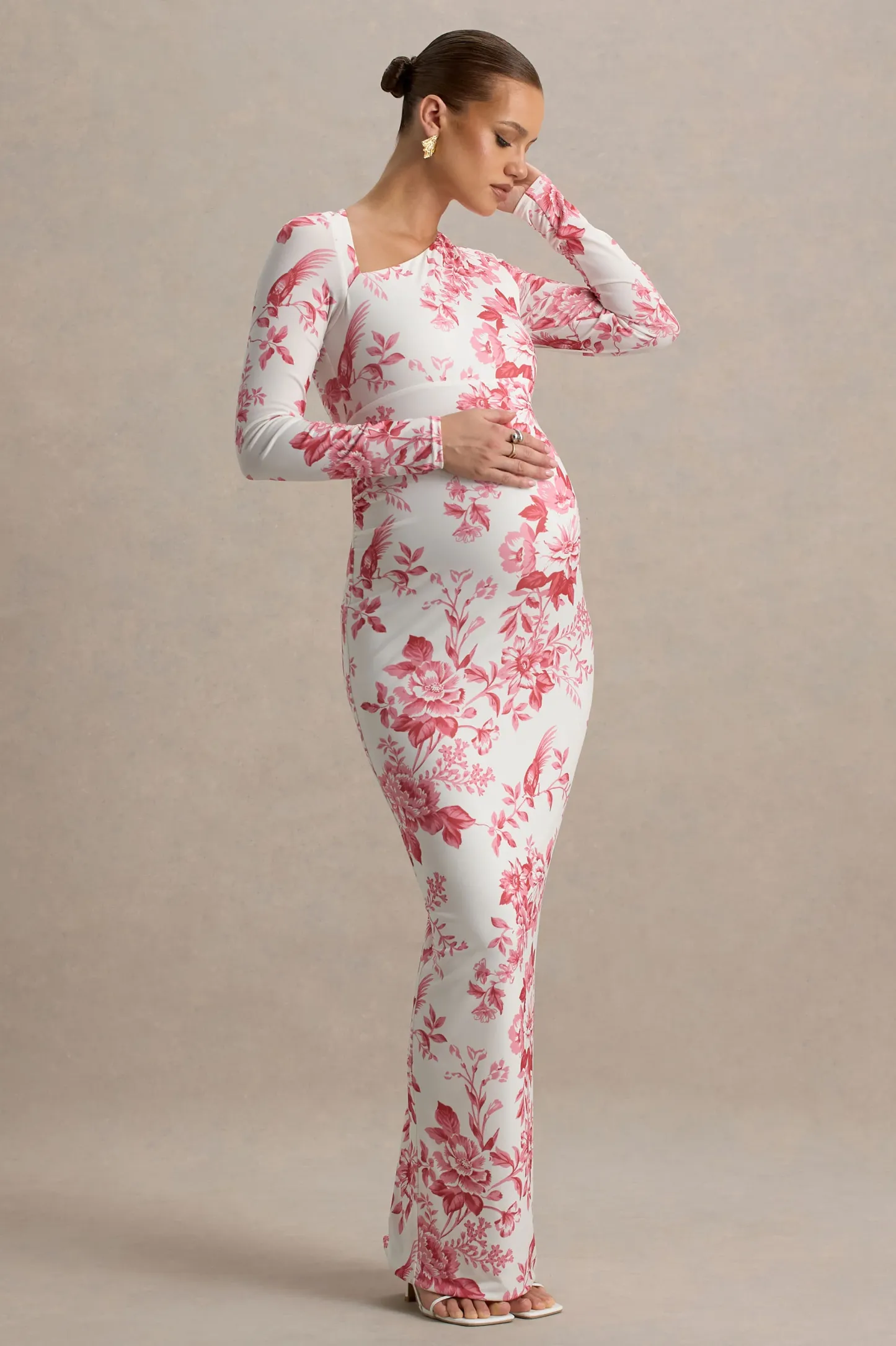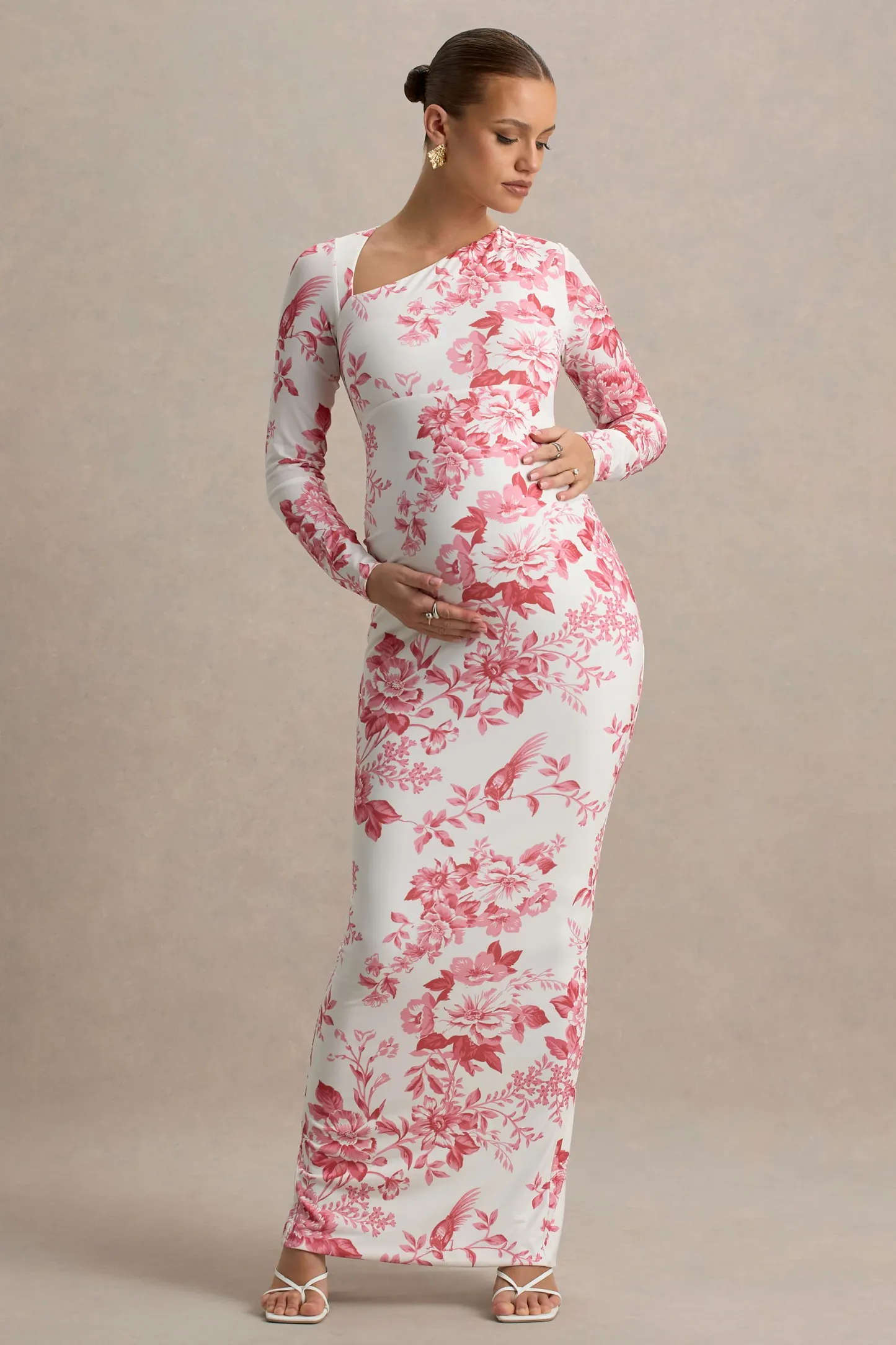 Pink Floral Print Asymmetric Long-Sleeve Maternity Maxi Dress