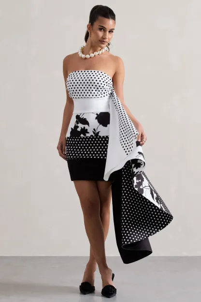 Multi Print Bandeau Mini Dress With Ruffled Side Drape